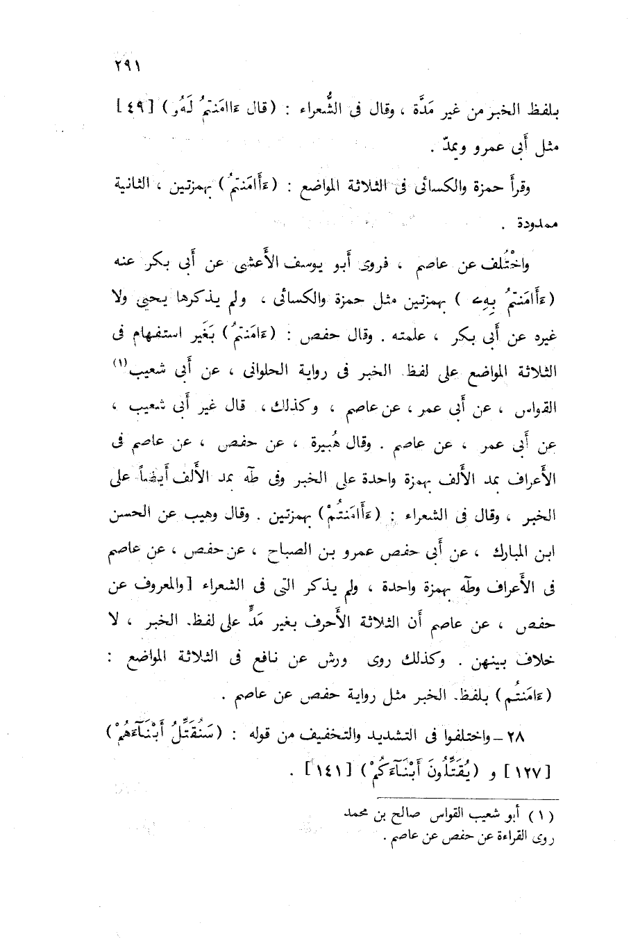 وَقَالَ وهيب عَن الْحسن ابْن الْمُبَارك عَن أَبى حَفْص عَمْرو بن الصَّباح عَن حَفْص عَن عَاصِم فى الْأَعْرَاف وطه بِهَمْزَة وَاحِدَة وَلم يذكر الَّتِى فى الشُّعَرَاء وَالْمَعْرُوف عَن حَفْص عَن عَاصِم أَن الثَّلَاثَة الأحرف بِغَيْر مد على لفظ الْخَبَر لَا خلاف بَينهُنَّ