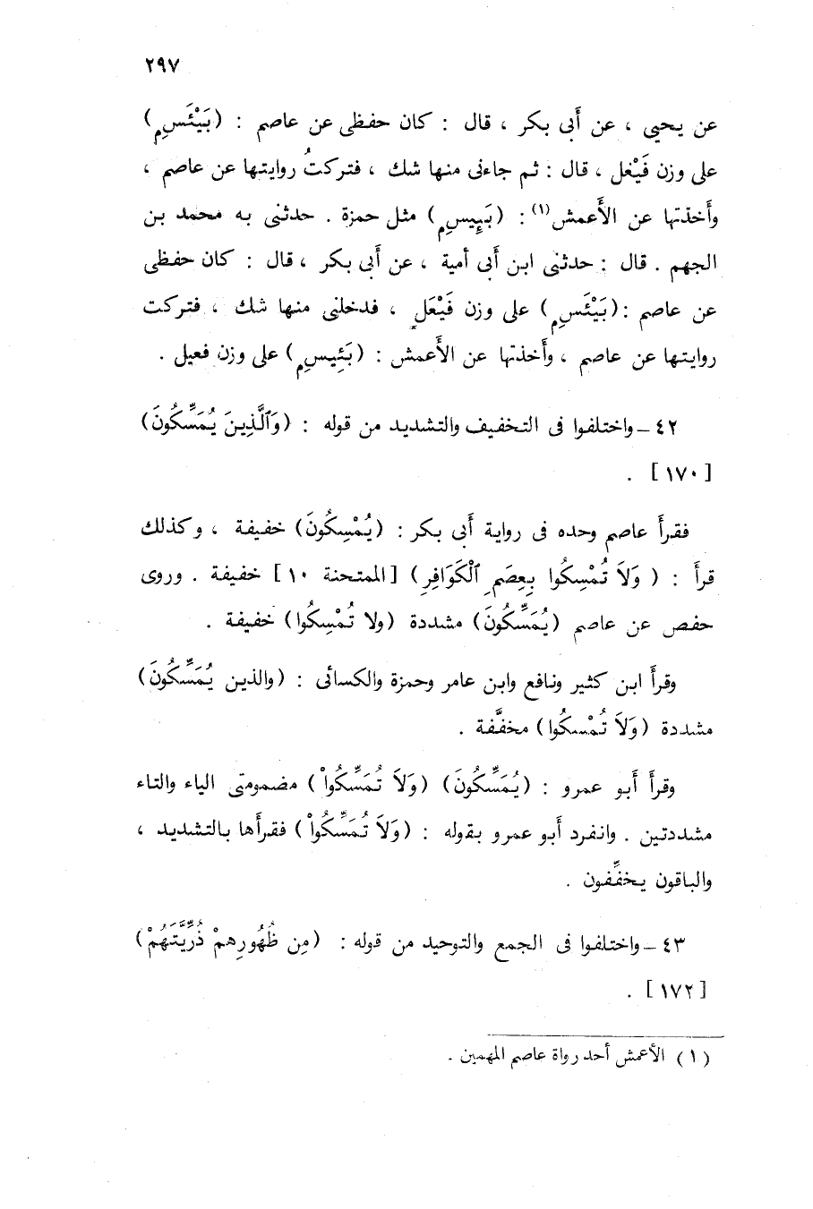 43 - وَاخْتلفُوا فى التَّخْفِيف وَالتَّشْدِيد من قَوْله {وَالَّذين يمسكون} 170
