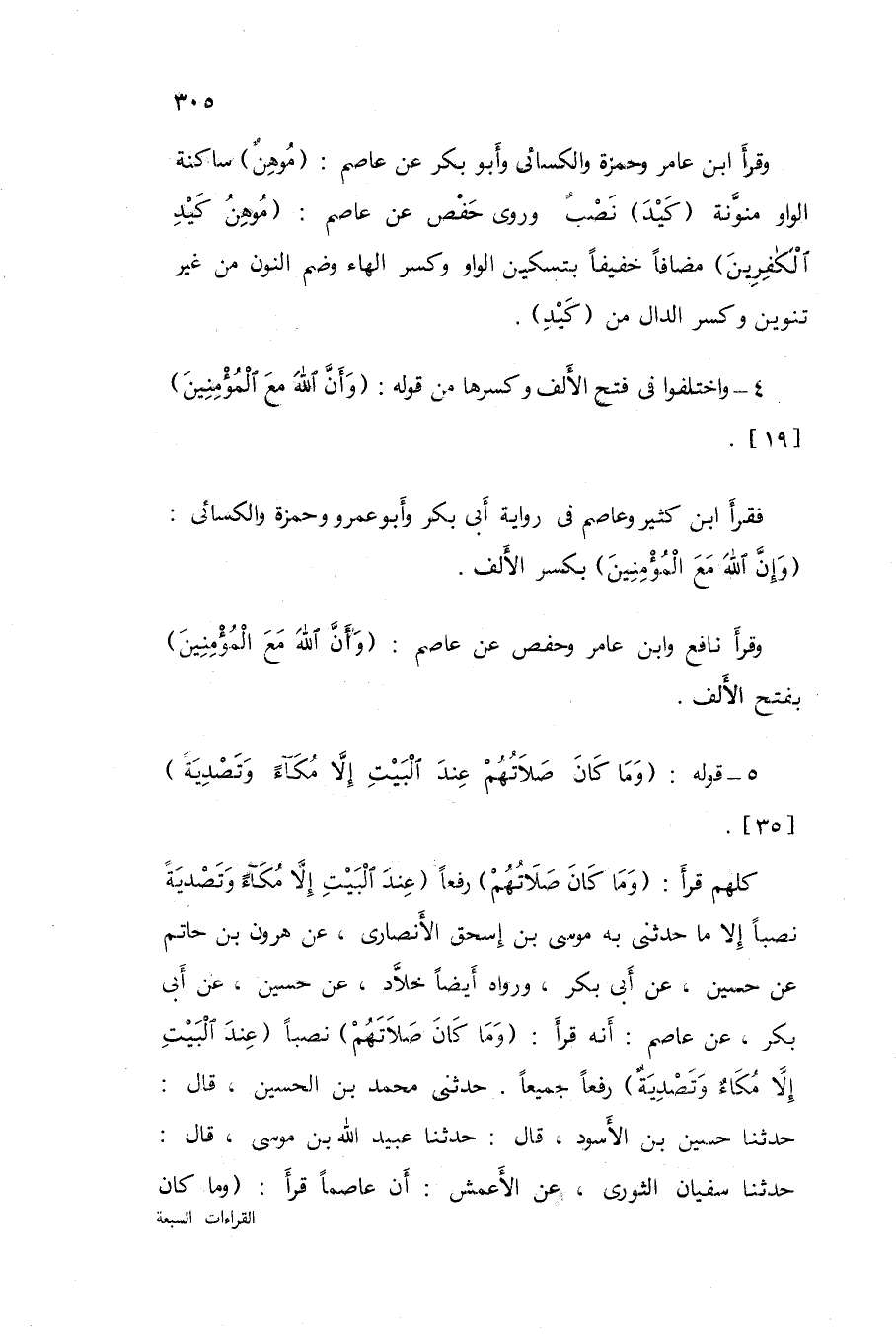 كلهم قَرَأَ {وَمَا كَانَ صلَاتهم} رفعا {عِنْد الْبَيْت إِلَّا مكاء وتصدية} نصبا إِلَّا مَا حَدَّثَنى بِهِ مُوسَى بن إِسْحَق الأنصارى عَن هرون بن حَاتِم عَن حُسَيْن عَن أَبى بكر وَرَوَاهُ أَيْضا خَلاد عَن حُسَيْن عَن أَبى بكر عَن عَاصِم أَنه قَرَأَ {وَمَا كَانَ صلَاتهم} نصبا {عِنْد الْبَيْت إِلَّا مكاء وتصدية} رفعا جَمِيعًا