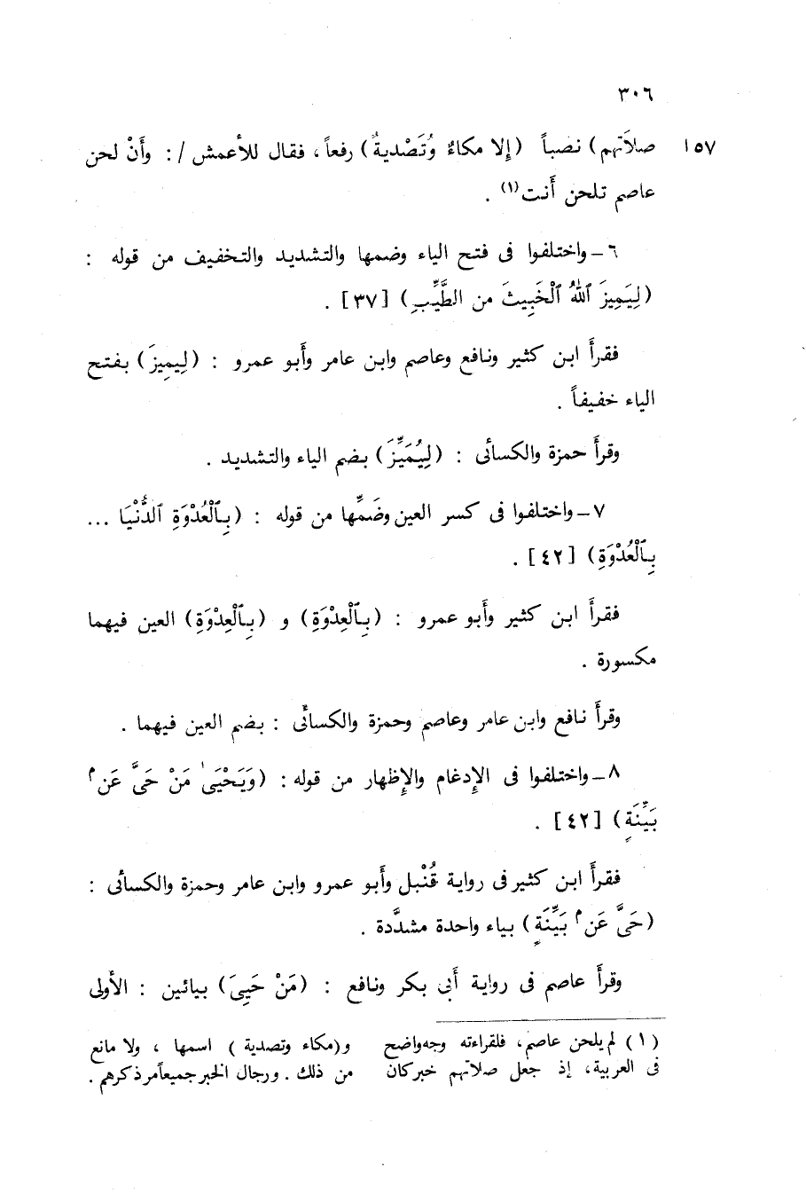 صلَاتهم) نصبا {إِلَّا مكاء وتصدية} رفعا فَقَالَ الْأَعْمَش وَأَن لحن عَاصِم تلحن أَنْت
