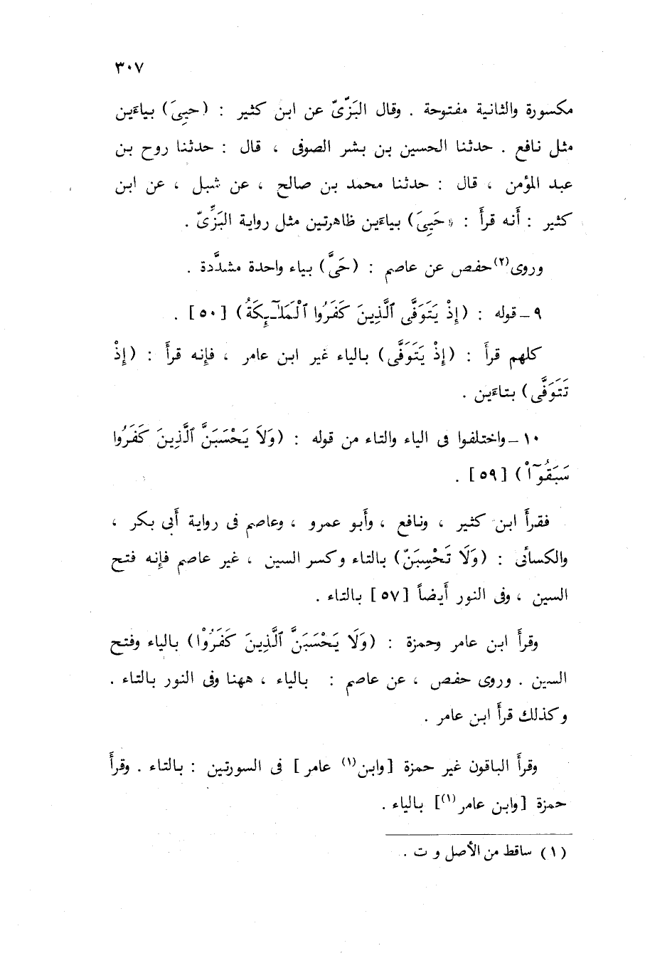 10 - وَاخْتلفُوا فى الْيَاء وَالتَّاء من قَوْله {وَلَا يَحسبن الَّذين كفرُوا سبقوا} 59