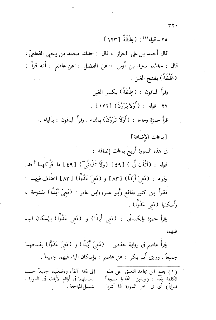 وَقَرَأَ عَاصِم فى رِوَايَة حَفْص {معي أبدا} و {معي عدوا} بفتحهما جَمِيعًا وَحَفْص يفتح {معي} فى كل الْقُرْآن