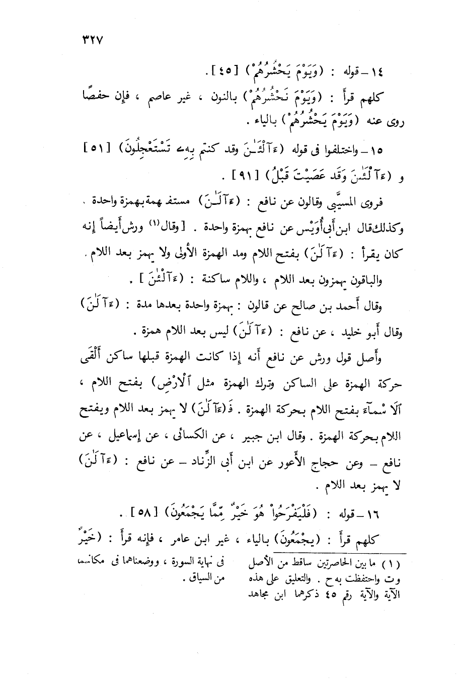 وَقَالَ ورش أَيْضا إِنَّه كَانَ يقْرَأ / ءآلن / بِفَتْح اللَّام وَمد الْهمزَة الأولى وَلَا يهمز بعد اللَّام