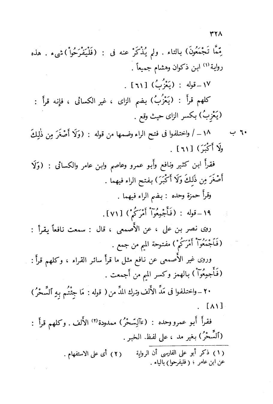 18 - وَاخْتلفُوا فى فتح الرَّاء وَضمّهَا من قَوْله {وَلَا أَصْغَر من ذَلِك وَلَا أكبر} 61