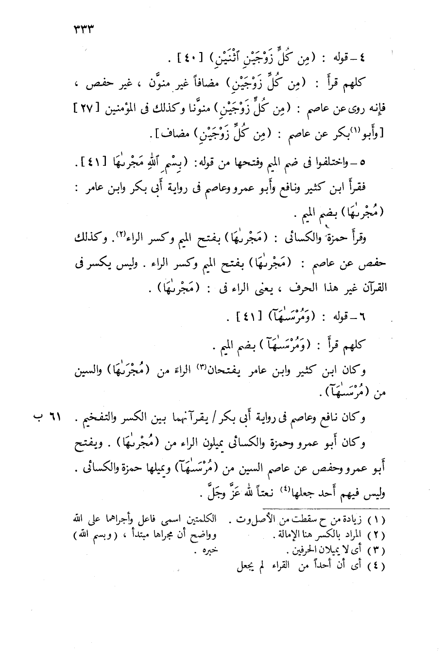فَقَرَأَ ابْن كثير وَنَافِع وَأَبُو عَمْرو وَعَاصِم فى رِوَايَة أَبى بكر وَابْن عَامر / مجرها / بِضَم الْمِيم