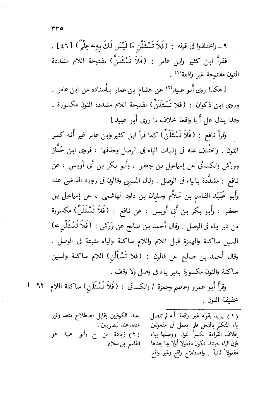 وَقَالَ المسيبى وقالون فى رِوَايَة القاضى عَنهُ وَأَبُو عبيد الْقَاسِم بن سَلام وَسليمَان بن دَاوُد الهاشمى عَن إِسْمَاعِيل بن جَعْفَر وَأَبُو بكر بن أَبى أويس عَن نَافِع / فَلَا تسئلن / مَكْسُورَة من غير يَاء فى الْوَصْل