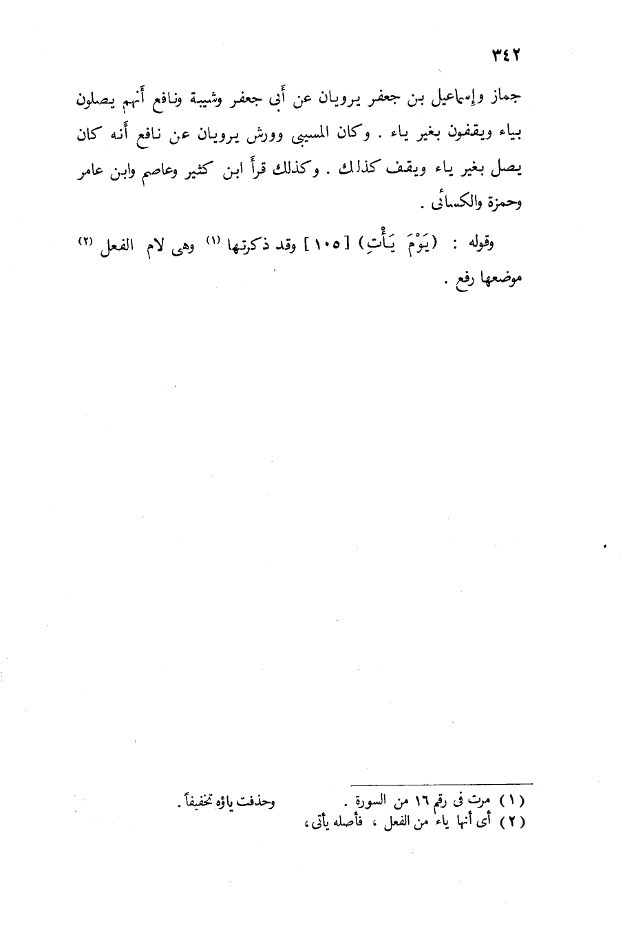 وَكَانَ المسيبى وورش يرويان عَن نَافِع أَنه كَانَ يصل بِغَيْر يَاء وَيقف كَذَلِك