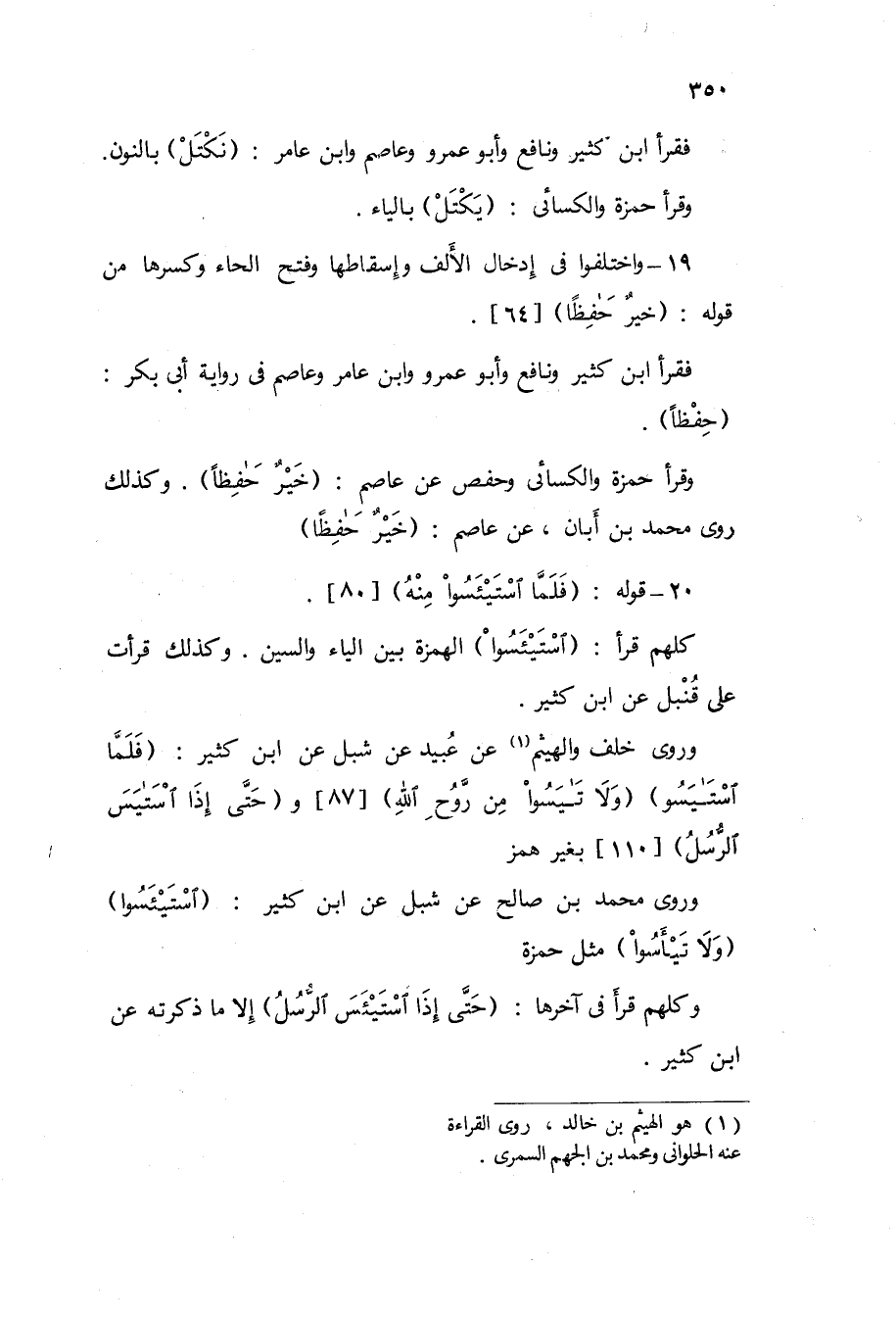 وروى خلف والهيثم عَن عبيد عَن شبْل عَن ابْن كثير / فَلَمَّا استيسو / / وَلَا تيسوا من روح الله / 87 و / حَتَّى إِذا استيس الرُّسُل / 110 بِغَيْر همز