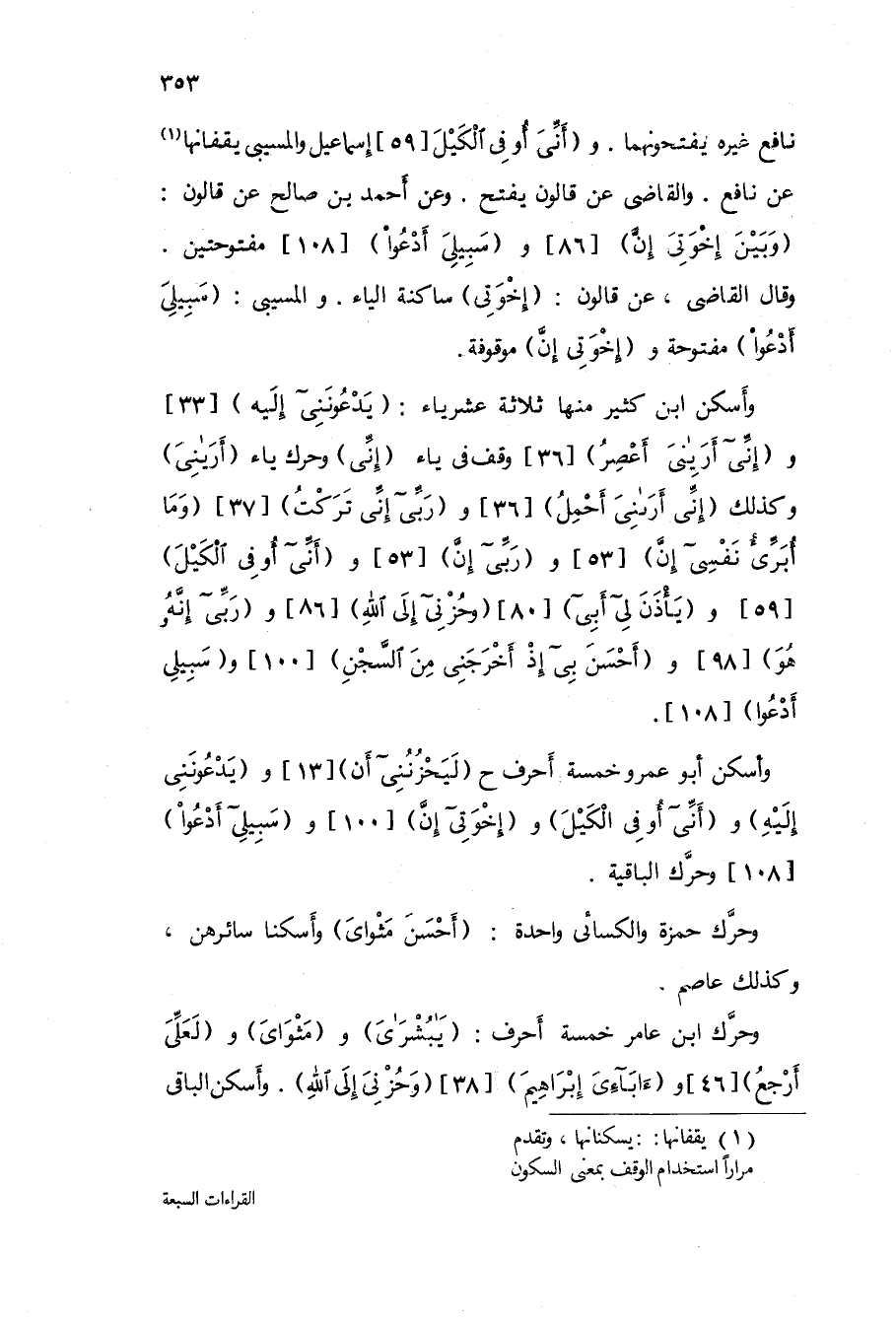 ورش بَين إخوتى مَوْقُوفَة و {سبيلي} مَفْتُوحَة وَعَن أَحْمد بن صَالح عَن قالون {وَبَين إخوتي إِن} 86 و {سبيلي أَدْعُو} 108 مفتوحتين