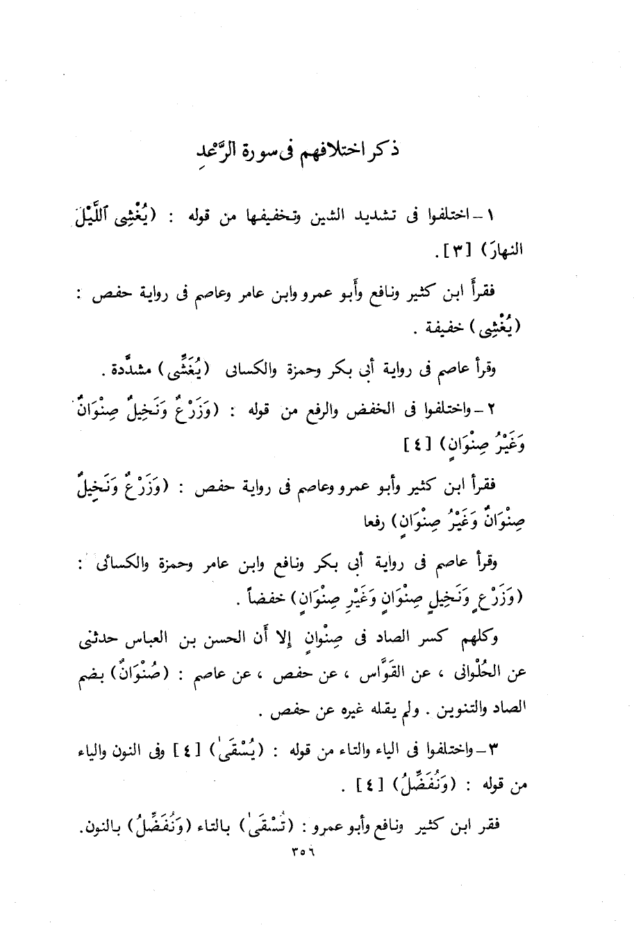 3 - وَاخْتلفُوا فى الْيَاء وَالتَّاء من قَوْله {يسقى} 4 وفى النُّون وَالْيَاء من قَوْله {ونفضل} 4