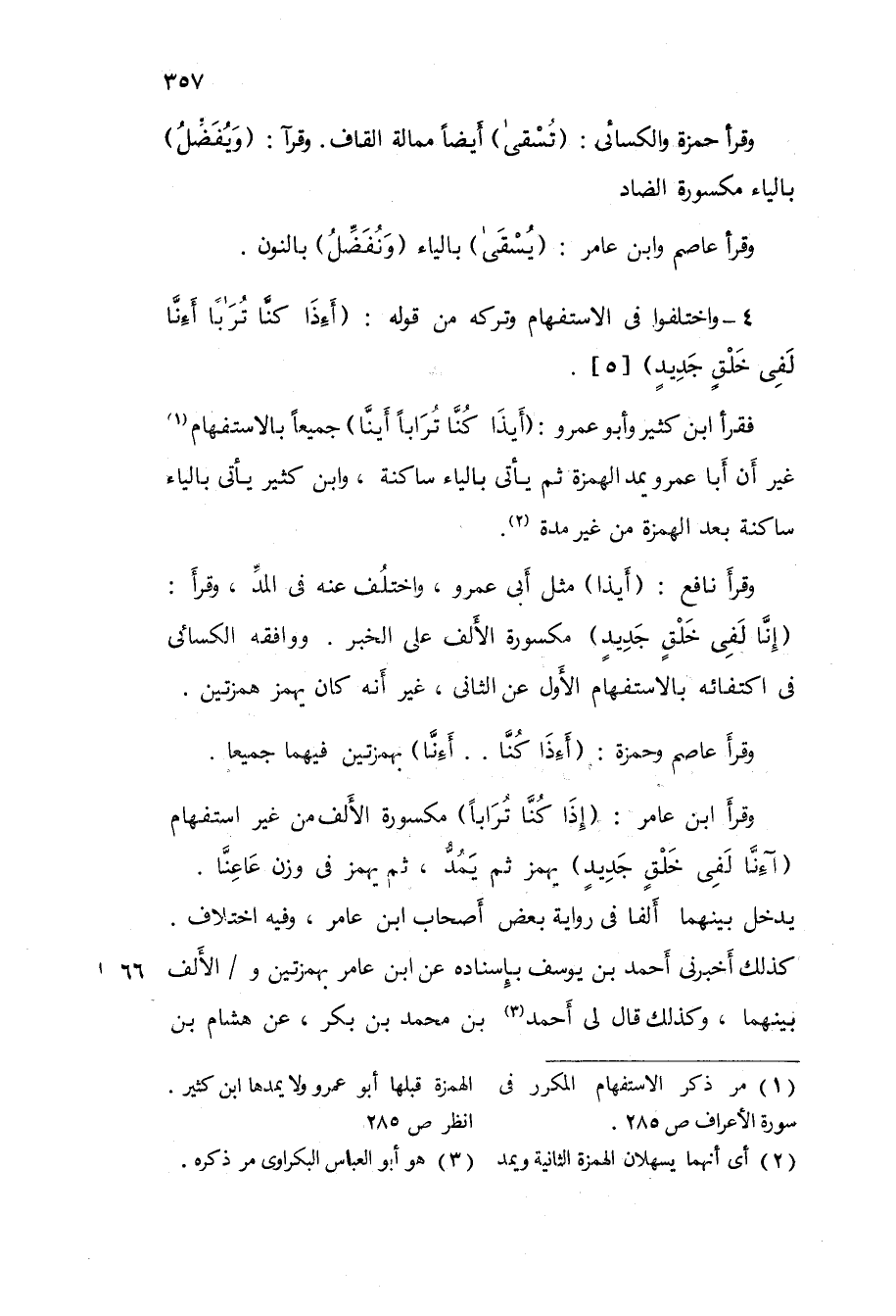 4 - وَاخْتلفُوا فى الِاسْتِفْهَام وَتَركه من قَوْله {أئذا كُنَّا تُرَابا أئنا لفي خلق جَدِيد} 5