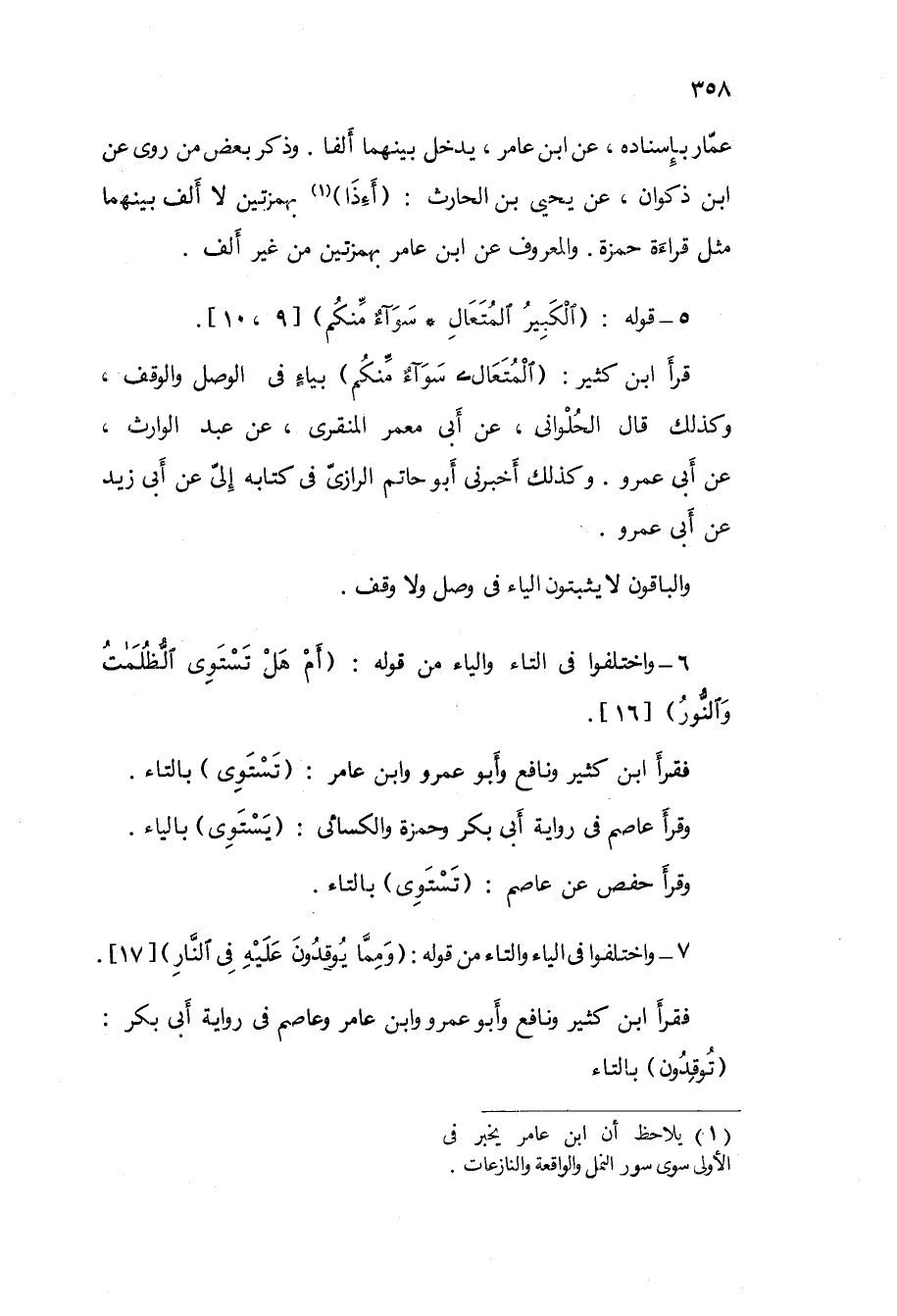 قَرَأَ ابْن كثير {المتعال سَوَاء مِنْكُم} بياء فى الْوَصْل وَالْوَقْف وَكَذَلِكَ قَالَ الحلوانى عَن أَبى معمر المنقرى عَن عبد الْوَارِث عَن أَبى عَمْرو