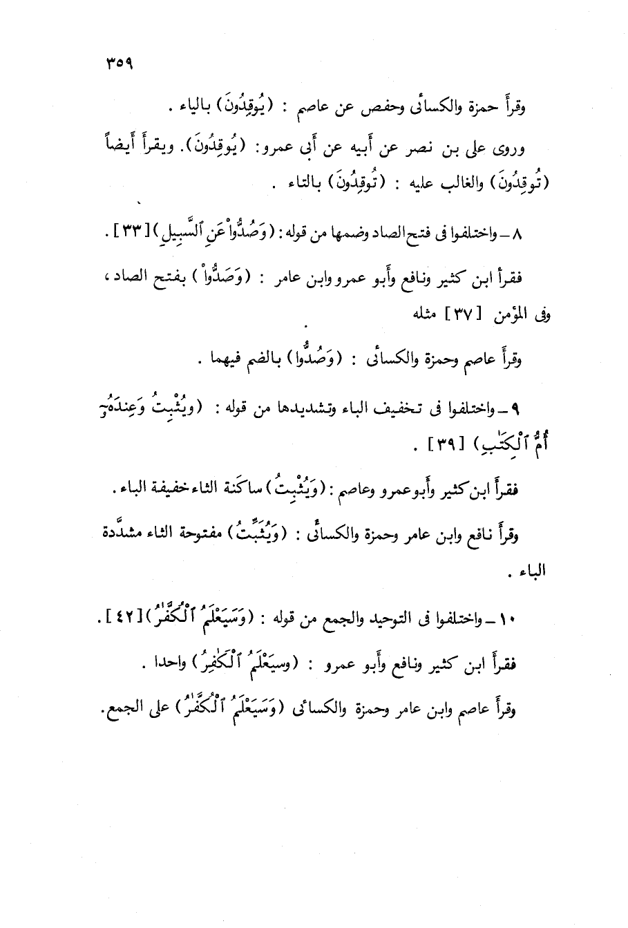 9 - وَاخْتلفُوا فى تَخْفيف الْبَاء وتشديدها من قَوْله {وَيثبت وَعِنْده أم الْكتاب} 39