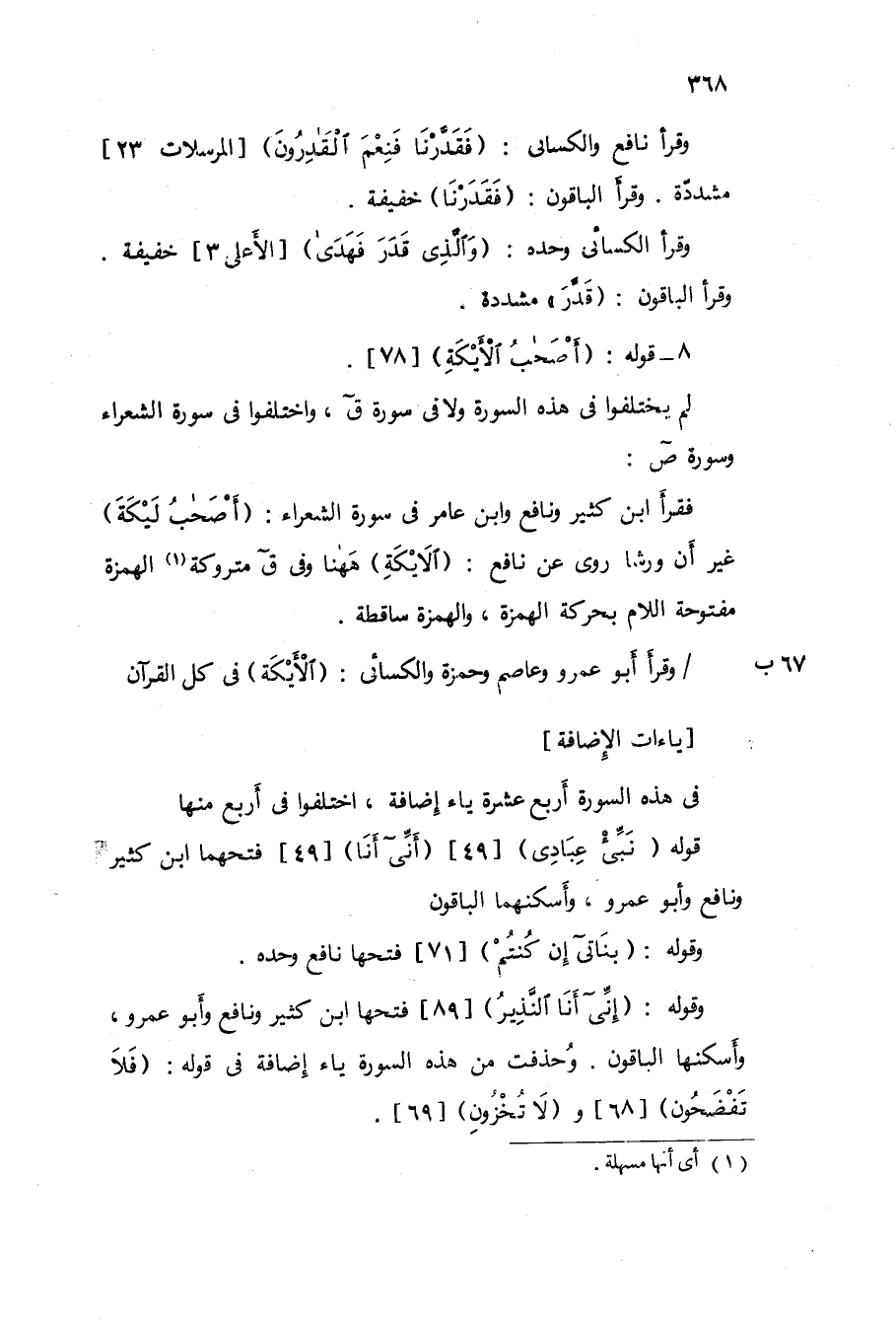وَقَوله {إِنِّي أَنا النذير} 89 فتحهَا ابْن كثير وَنَافِع وَأَبُو عَمْرو وأسكنها الْبَاقُونَ