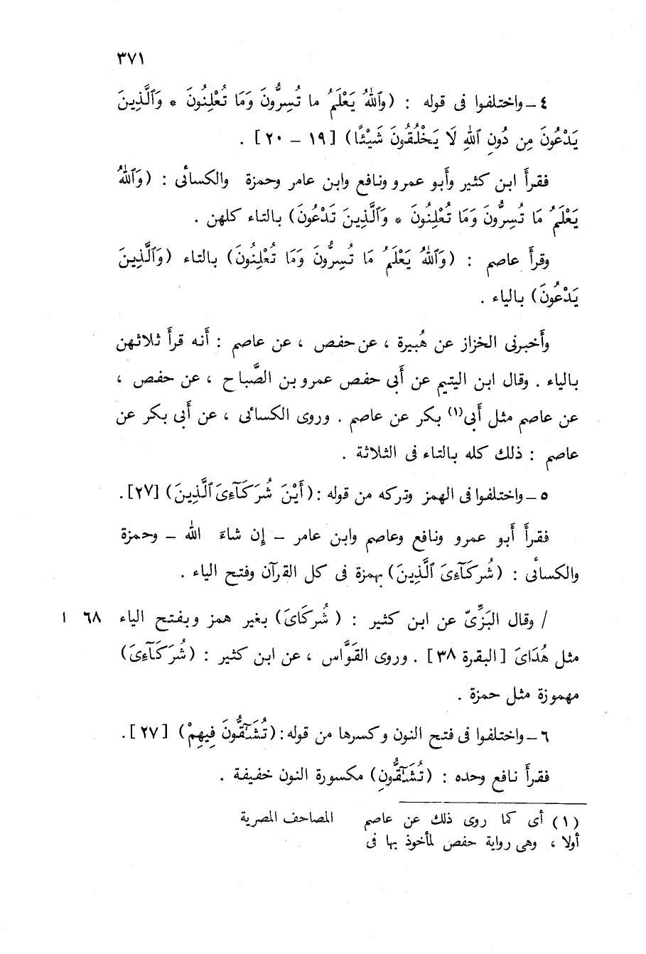 فَقَرَأَ أَبُو عَمْرو وَنَافِع وَعَاصِم وَابْن عَامر إِن شَاءَ الله وَحَمْزَة والكسائى / شركآءى الَّذين / بِهَمْزَة فى كل الْقُرْآن وَفتح الْيَاء