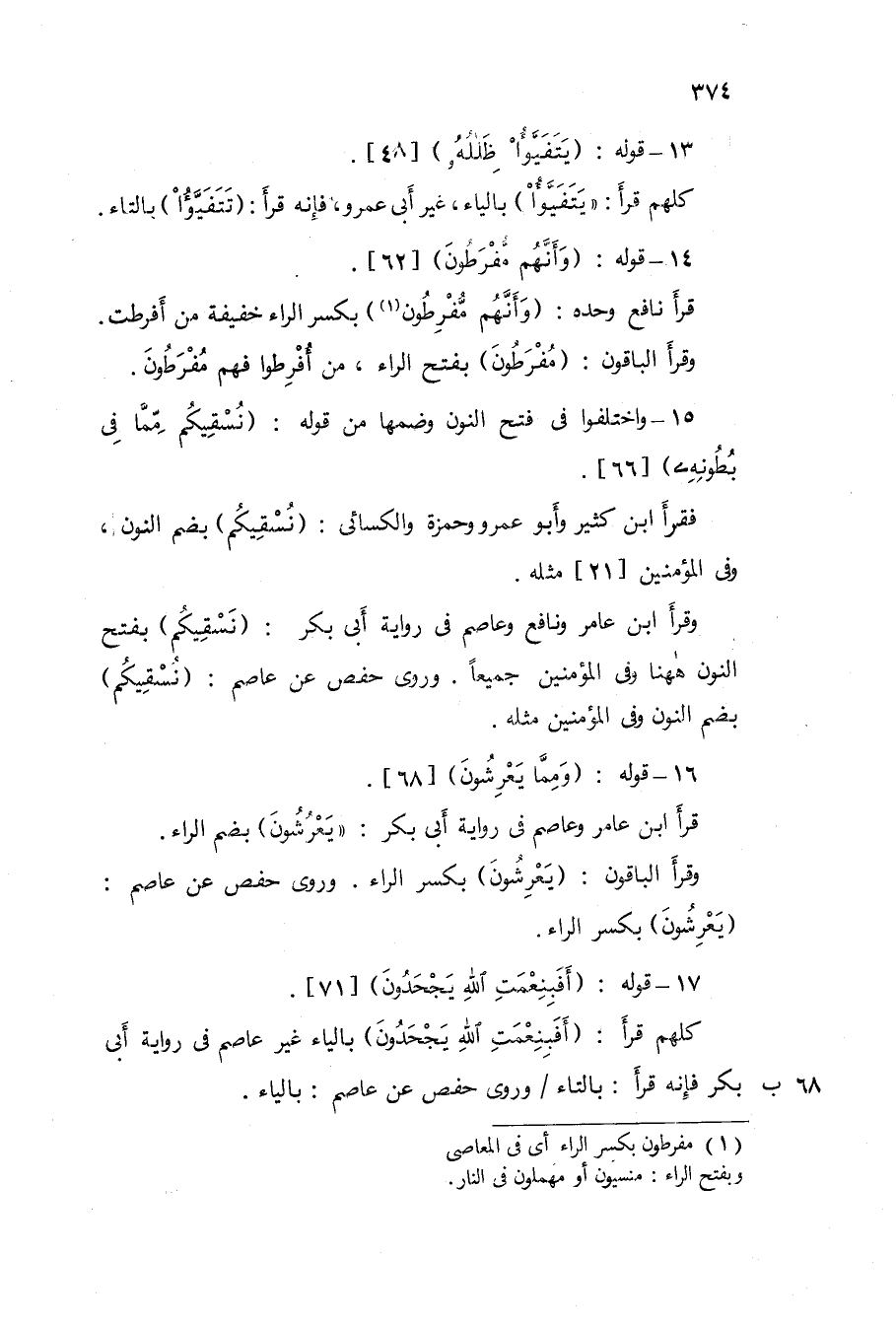 كلهم قَرَأَ / يتفيوأ / بِالْيَاءِ غير أَبى عَمْرو فَإِنَّهُ قَرَأَ / تتفيوأ / بِالتَّاءِ