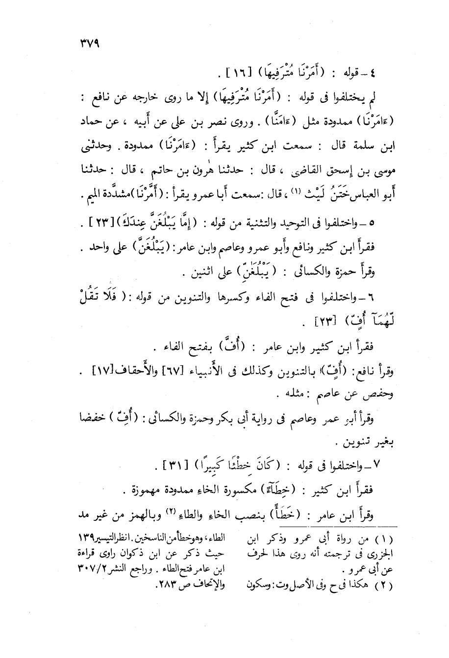 6 - وَاخْتلفُوا فى فتح الْفَاء وَكسرهَا والتنوين من قَوْله {فَلَا تقل لَهما أُفٍّ} 23