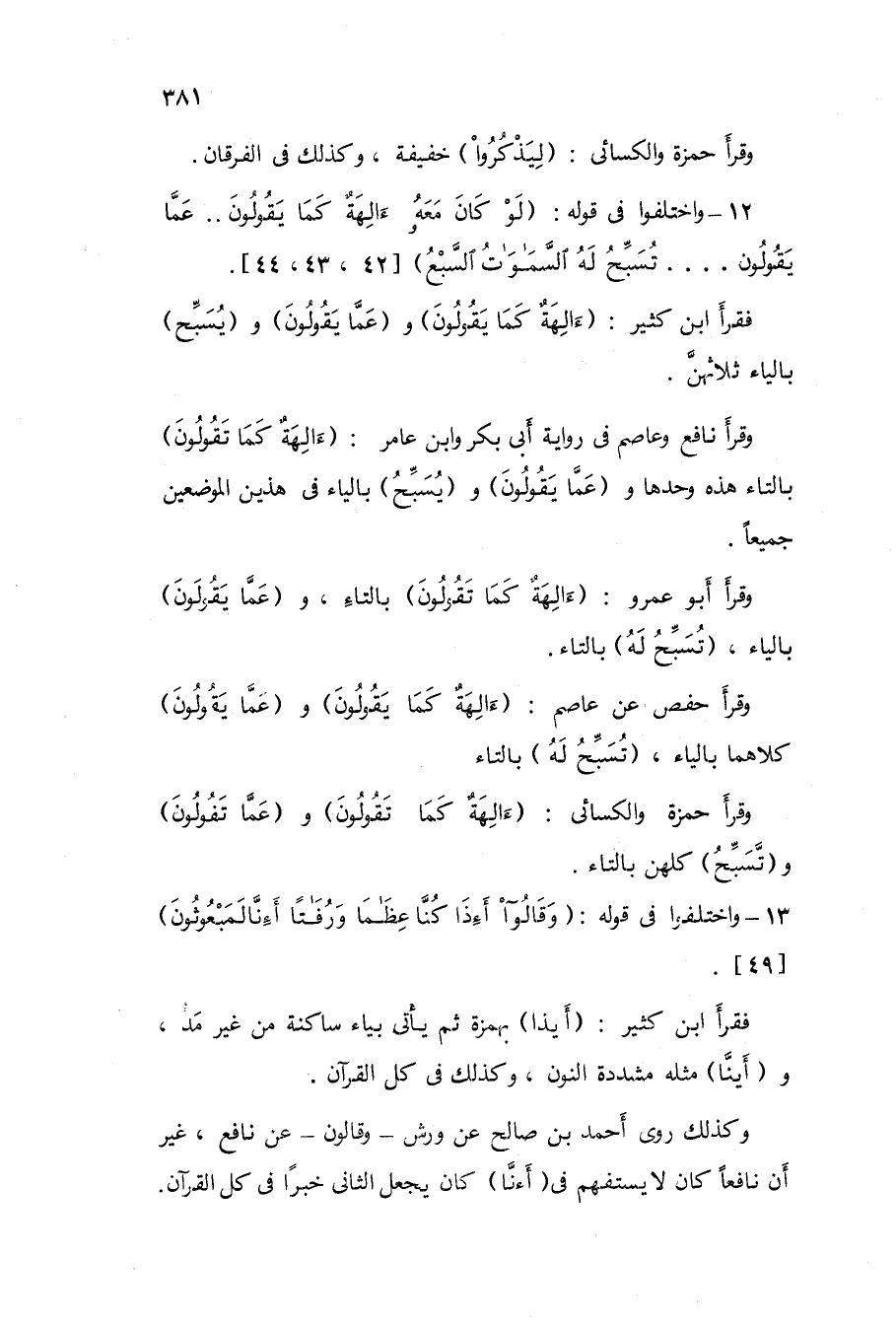 وَقَرَأَ نَافِع وَعَاصِم فى رِوَايَة أَبى بكر وَابْن عَامر / ءالهة كَمَا تَقولُونَ / بِالتَّاءِ هَذِه وَحدهَا و {عَمَّا يَقُولُونَ} و {يسبح} بِالْيَاءِ فى هذَيْن الْمَوْضِعَيْنِ جَمِيعًا