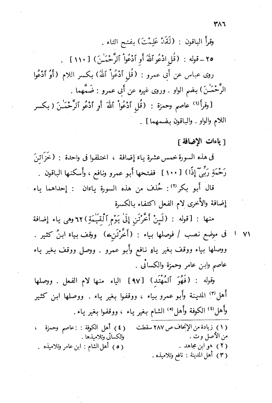 وَوَصلهَا ابْن كثير وَأهل الْكُوفَة وَأهل الشَّام بِغَيْر يَاء ووقفوا بِغَيْر يَاء