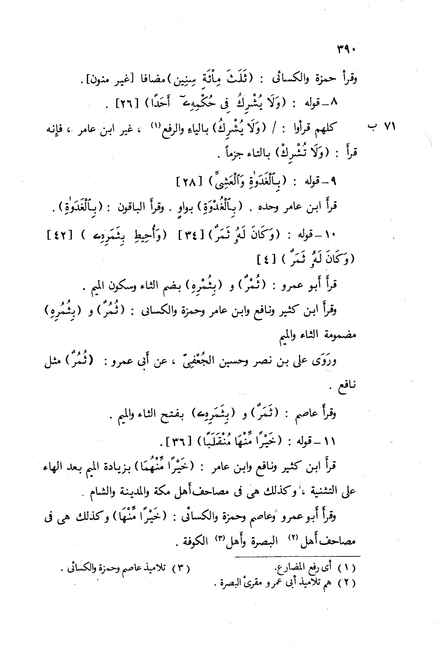 كلهم قرأوا {وَلَا يُشْرك} بِالْيَاءِ وَالرَّفْع غير ابْن عَامر فَإِنَّهُ قَرَأَ / وَلَا تشرك / بِالتَّاءِ جزما