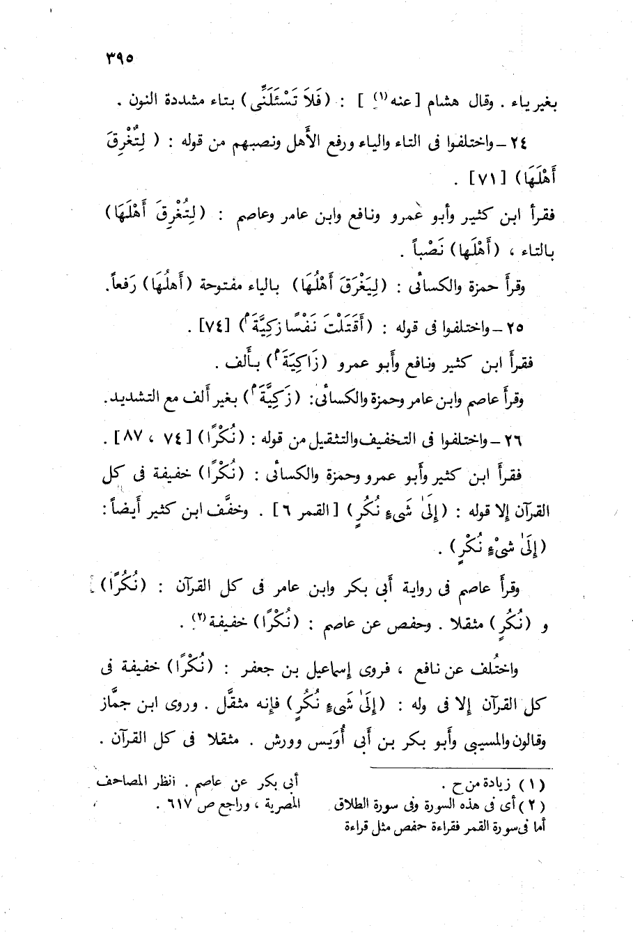 وَقَرَأَ عَاصِم فى رِوَايَة أَبى بكر وَابْن عَامر فى كل الْقُرْآن {نكرا} و {نكر} مُثقلًا