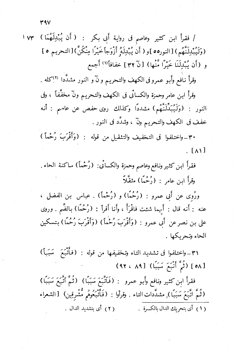 31 - وَاخْتلفُوا فى تَشْدِيد التَّاء وتخفيفها من قَوْله {فأتبع سَببا} 85 {ثمَّ أتبع سَببا} 89 92