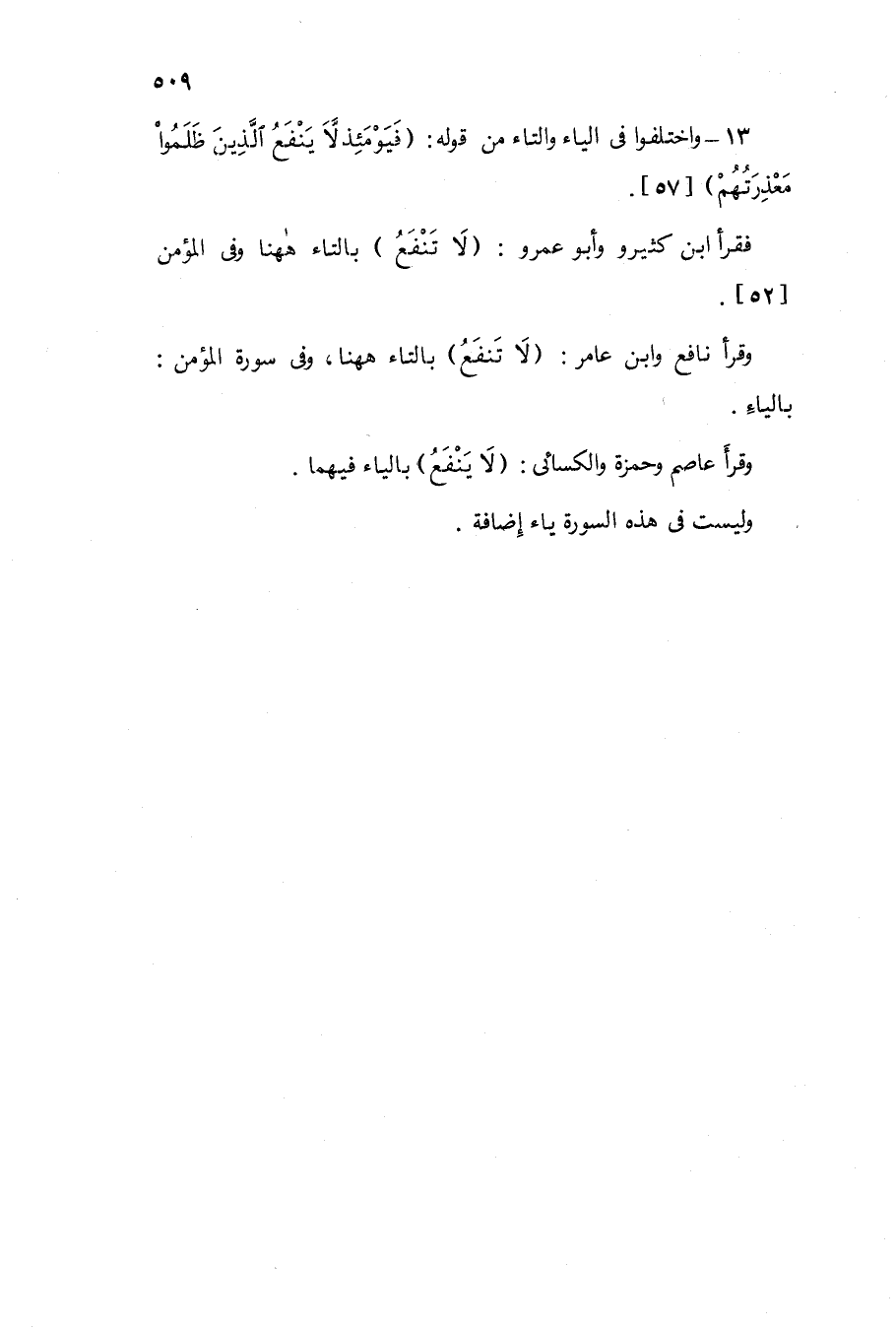 13 - وَاخْتلفُوا فى الْيَاء وَالتَّاء من قَوْله {فَيَوْمئِذٍ لَا ينفع الَّذين ظلمُوا معذرتهم} 57
