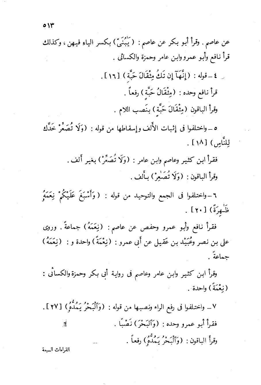 7 - وَاخْتلفُوا فى رفع الرَّاء ونصبها من قَوْله {وَالْبَحْر يمده} 27