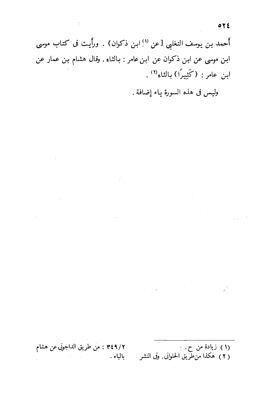 وَرَأَيْت فى كتاب مُوسَى ابْن مُوسَى عَن ابْن ذكْوَان عَن ابْن عَامر بالثاء