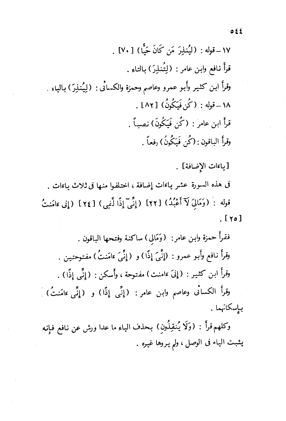 فى هَذِه السُّورَة عشر ياءات إِضَافَة اخْتلفُوا مِنْهَا فى ثَلَاث ياءات