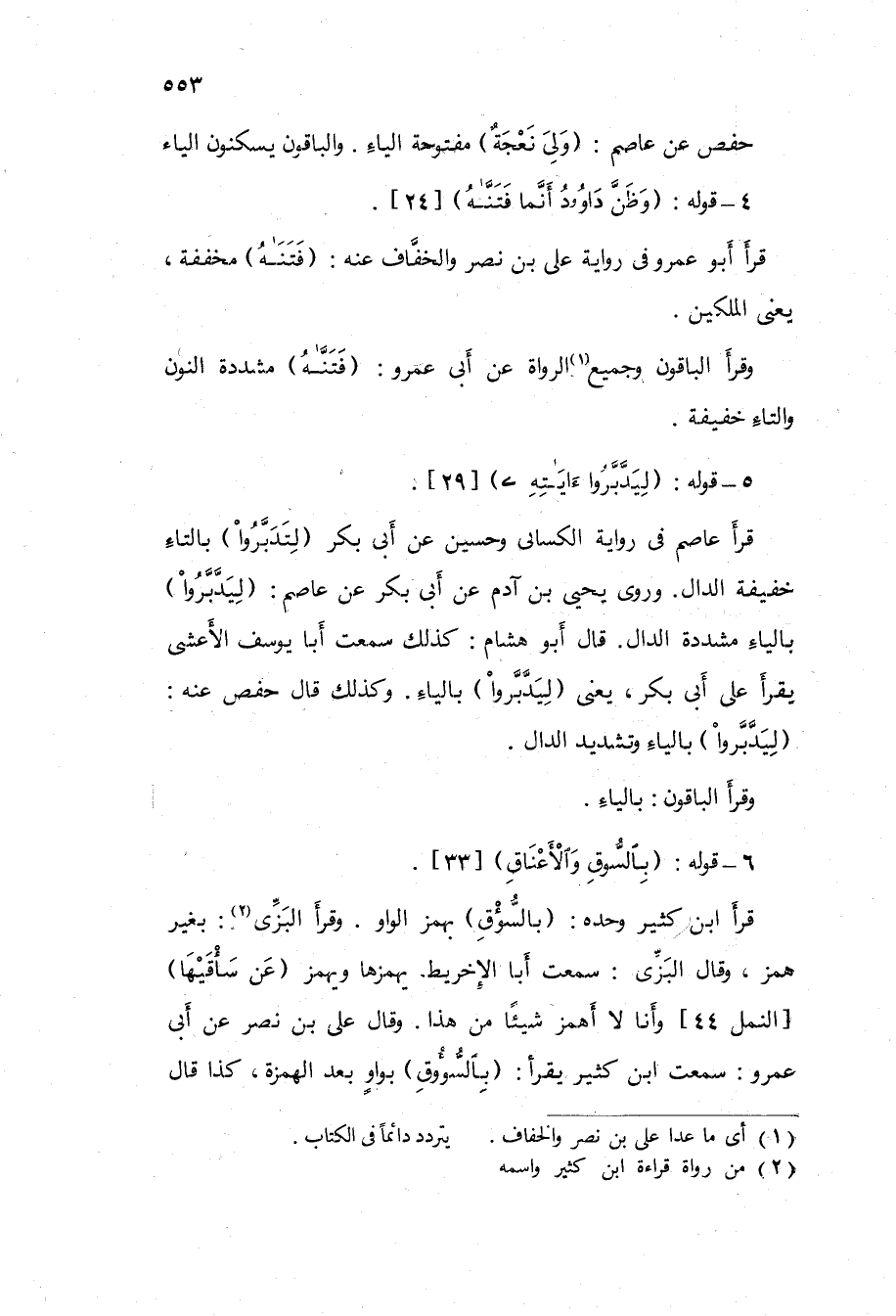 قَرَأَ عَاصِم فى رِوَايَة الكسائى وحسين عَن أَبى بكر / لتدبروا / بِالتَّاءِ خَفِيفَة الدَّال