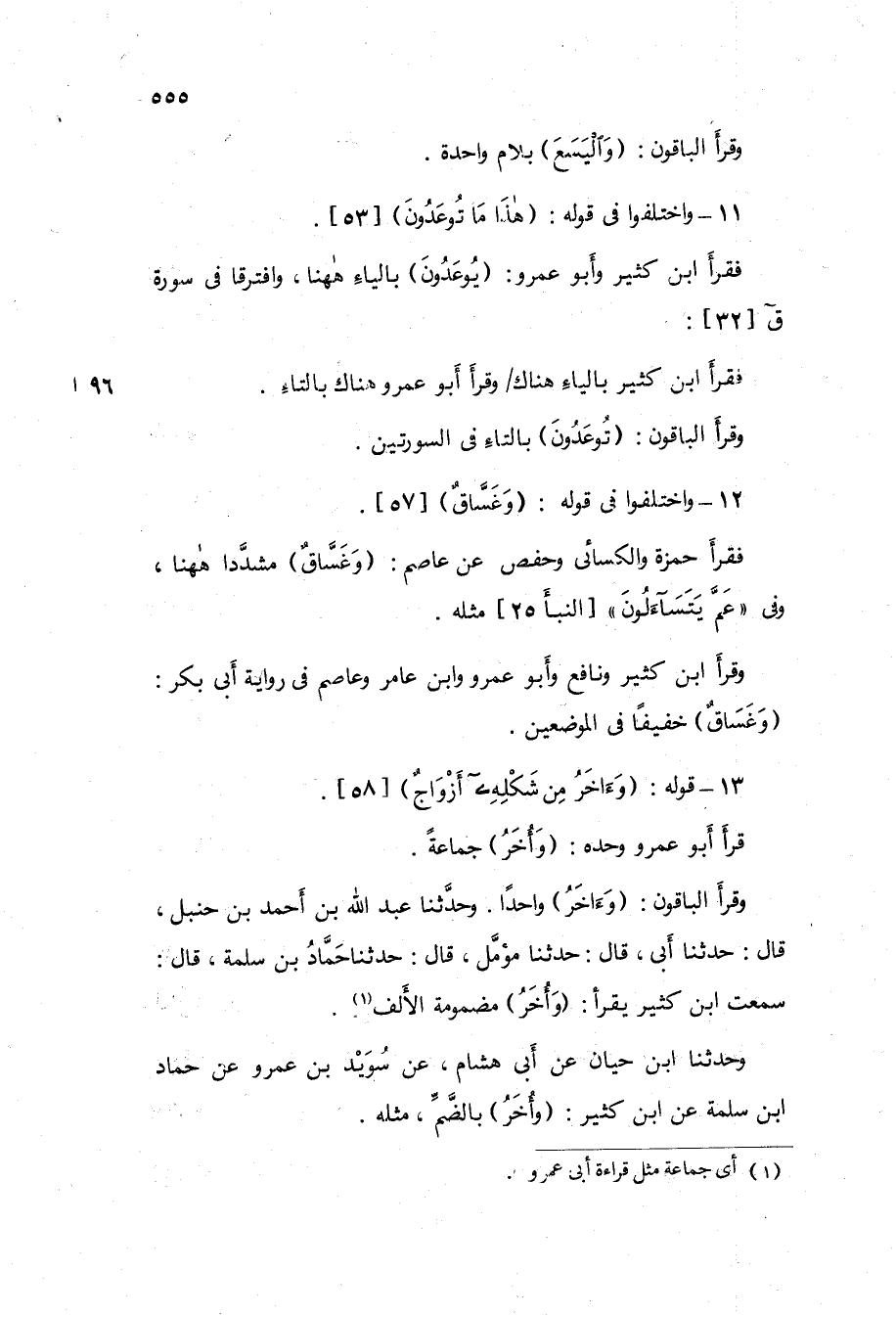 وَحدثنَا عبد الله بن أَحْمد بن حَنْبَل قَالَ حَدثنَا أَبى قَالَ حَدثنَا مُؤَمل قَالَ حَدثنَا حَمَّاد بن سَلمَة قَالَ سَمِعت ابْن كثير يقْرَأ {وَأخر} مَضْمُومَة الْألف