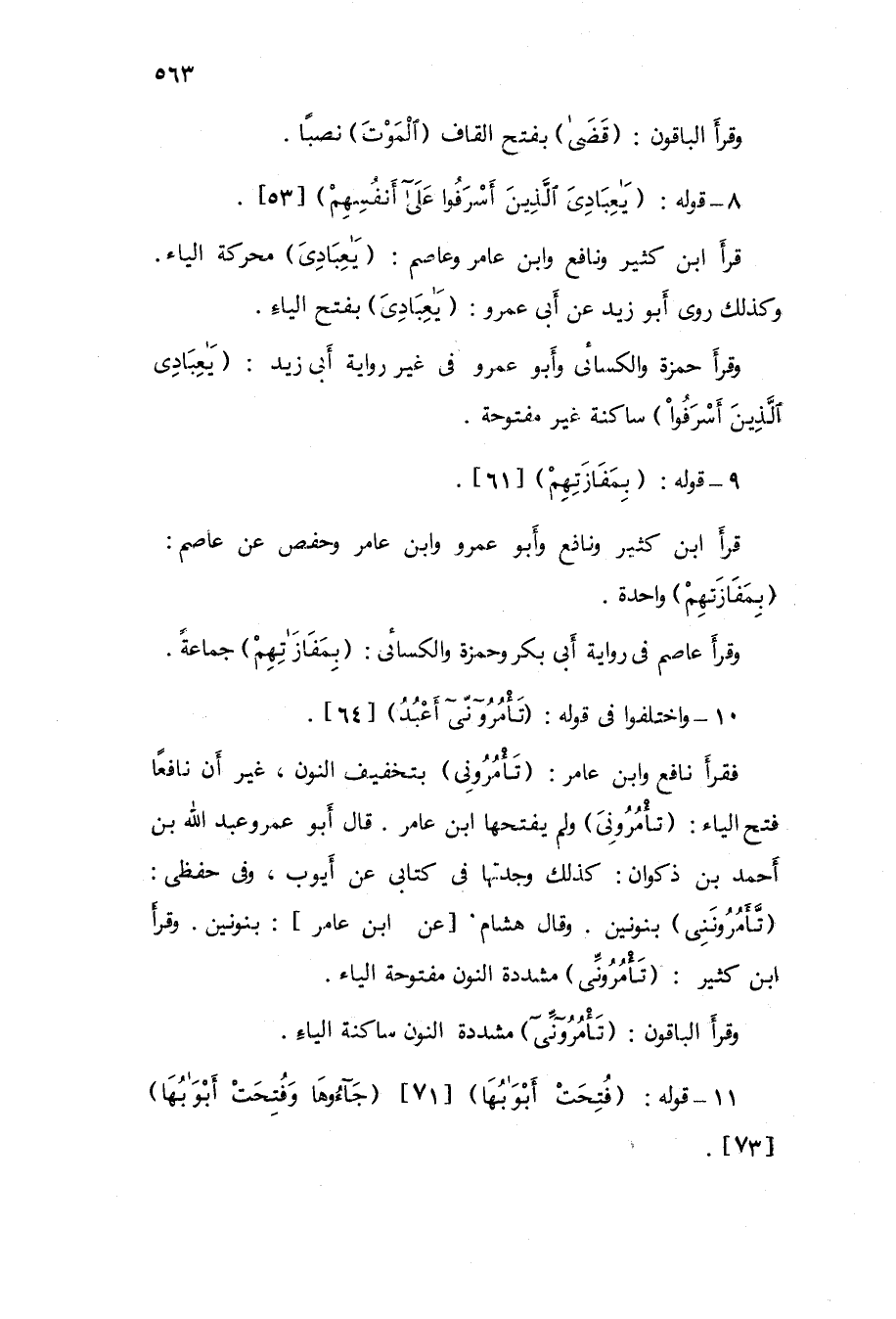 وَقَرَأَ حَمْزَة والكسائى وَأَبُو عَمْرو فى غير رِوَايَة أَبى زيد {يَا عبَادي الَّذين أَسْرفُوا} سَاكِنة غير مَفْتُوحَة