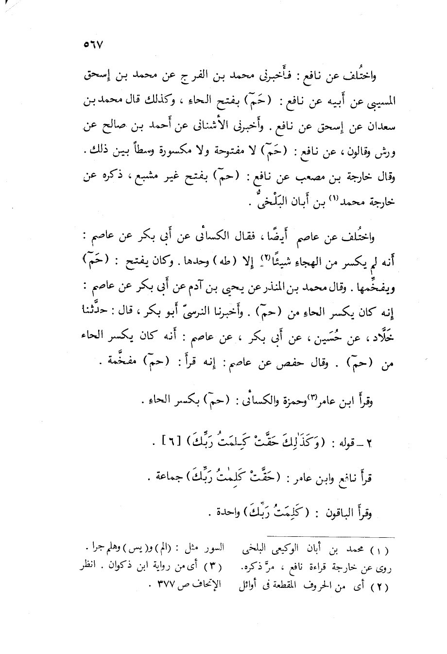 وَاخْتلف عَن نَافِع فأخبرنى مُحَمَّد بن الْفرج عَن مُحَمَّد بن إِسْحَق المسيبى عَن أَبِيه عَن نَافِع {حم} بِفَتْح الْحَاء وَكَذَلِكَ قَالَ مُحَمَّد بن سَعْدَان عَن إِسْحَق عَن نَافِع