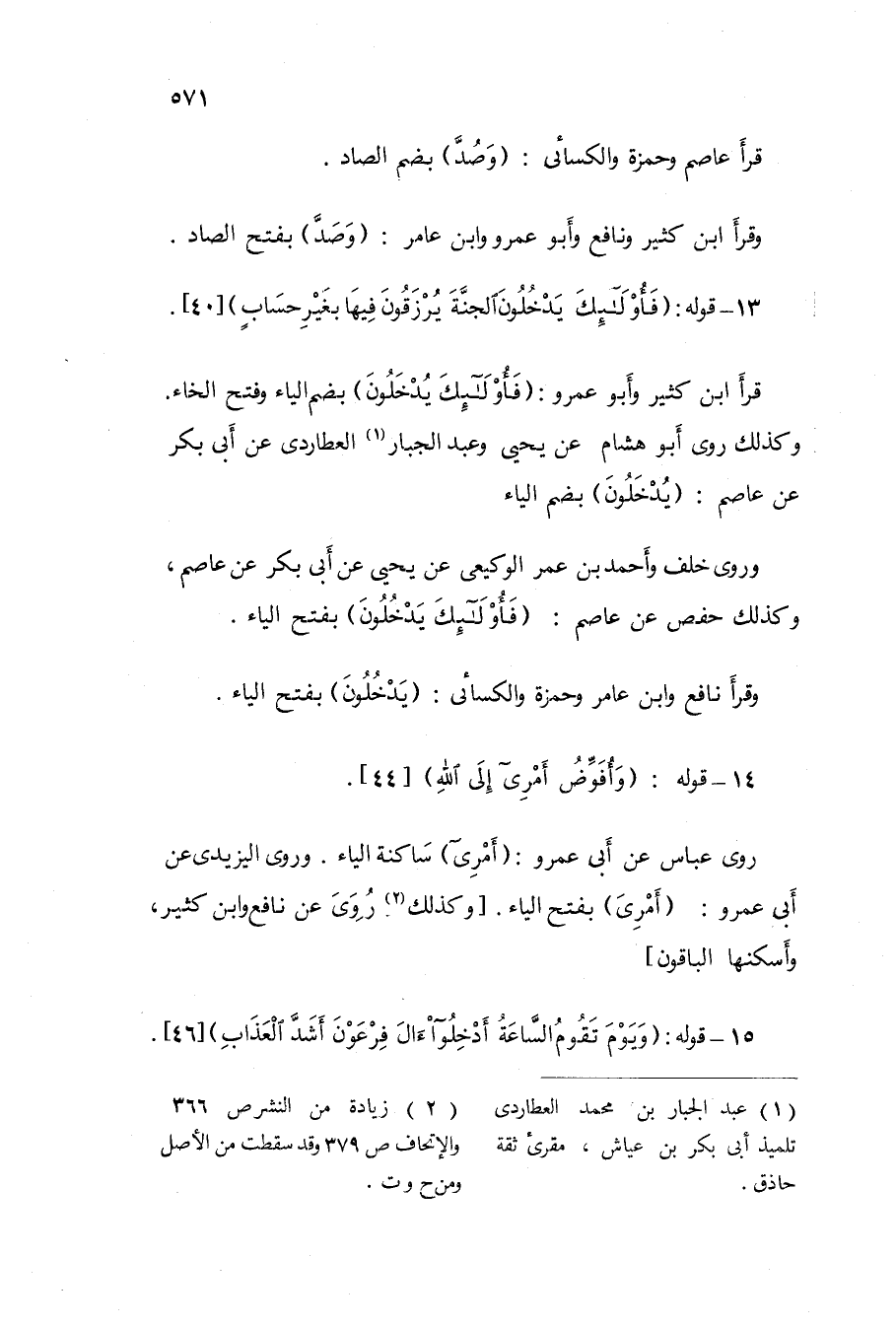 وَكَذَلِكَ روى أَبُو هِشَام عَن يحيى وَعبد الْجَبَّار العطاردى عَن أَبى بكر عَن عَاصِم {يدْخلُونَ} بِضَم الْيَاء