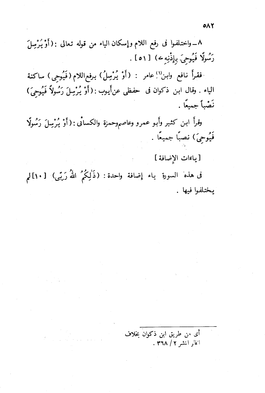 وَقَرَأَ ابْن كثير وَأَبُو عَمْرو وَعَاصِم وَحَمْزَة والكسائى {أَو يُرْسل رَسُولا فَيُوحِي} نصبا جَمِيعًا