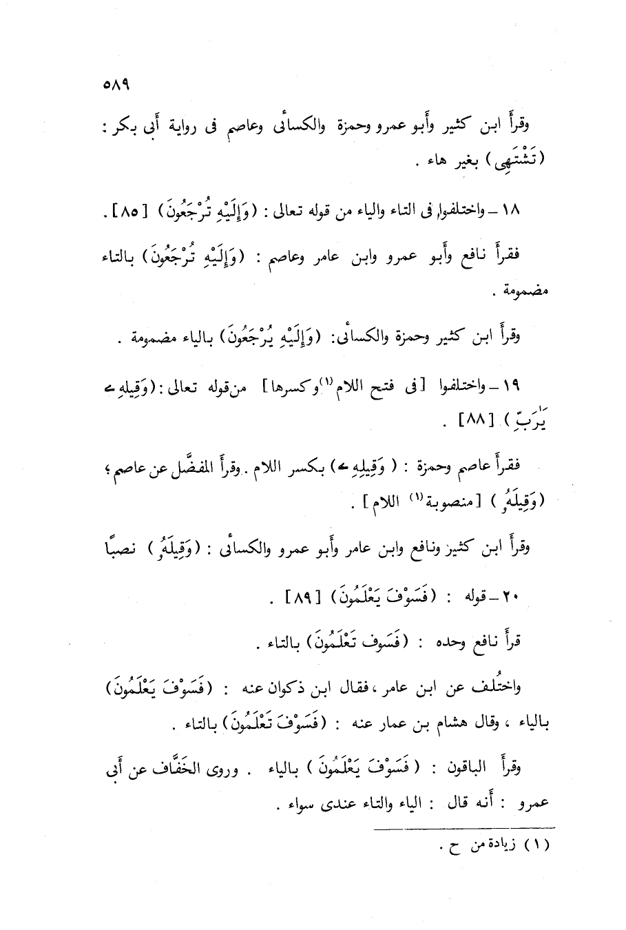 19 - وَاخْتلفُوا فى فتح اللَّام وَكسرهَا من قَوْله تَعَالَى {وقيله يَا رب} 88