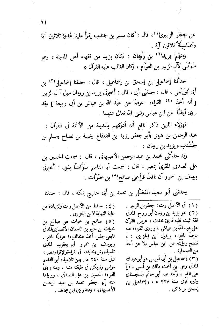 وحَدثني أَبُو سعيد الْمفضل بن مُحَمَّد بن إِبْرَاهِيم بِمَكَّة قَالَ حَدثنَا أَبُو جمة مُحَمَّد بن يُوسُف الزيدي قَالَ أَبُو بكر فَقلت لَهُ الزبيدِيّ فَقَالَ الزُّبْدِيُّ قَالَ حَدثنَا أَبُو قُرَّة سَمِعت نَافِعًا يَقُول قَرَأت على سبعين من التَّابِعين