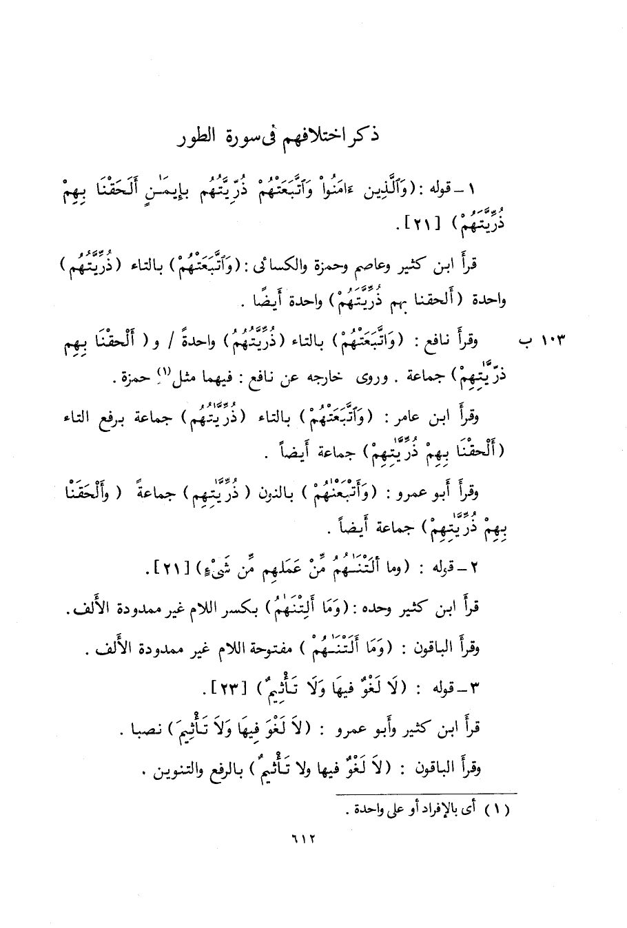 وَقَرَأَ نَافِع {وَاتَّبَعتهمْ} بِالتَّاءِ {ذُرِّيتهمْ} وَاحِدَة و {ألحقنا بهم ذُرِّيتهمْ} جمَاعَة