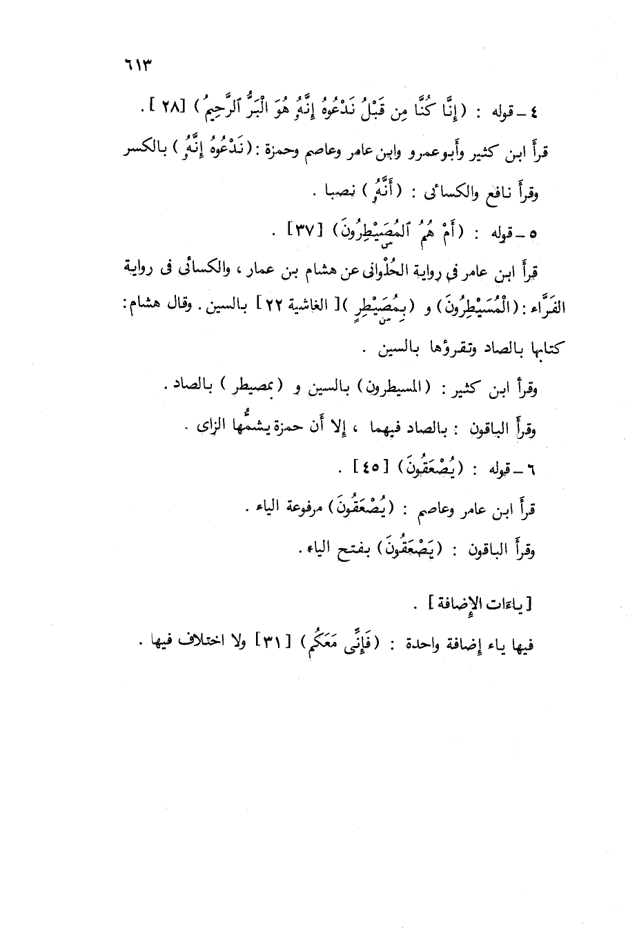 قَرَأَ ابْن عَامر فى رِوَايَة الحلوانى عَن هِشَام بن عمار والكسائى فى رِوَايَة الْفراء / المسيطرون / و {بمصيطر} الغاشية 22 بِالسِّين