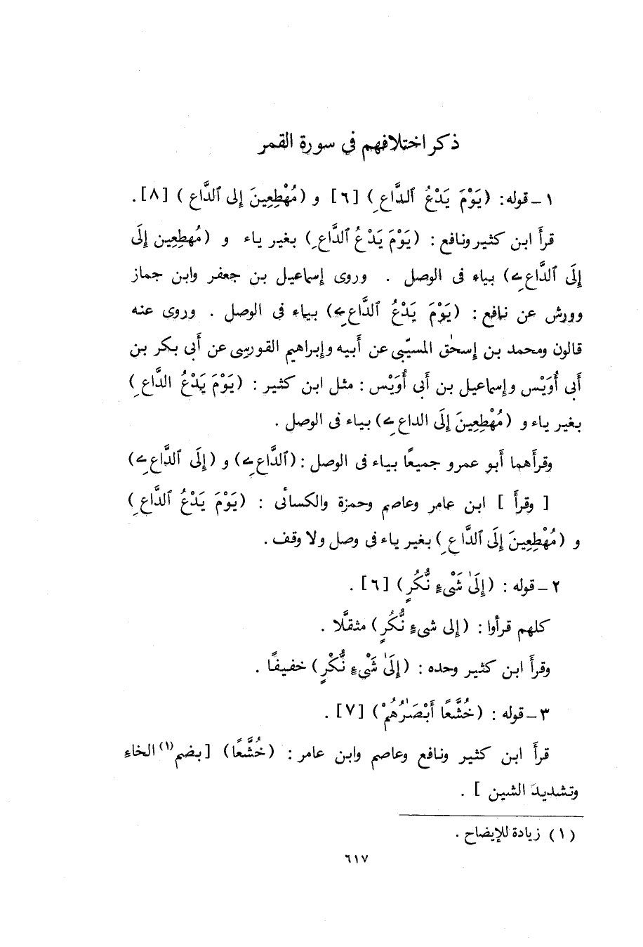 قَرَأَ ابْن كثير وَنَافِع {يَوْم يدع الداع} بِغَيْر يَاء و {مهطعين إِلَى الداع} بياء فى الْوَصْل