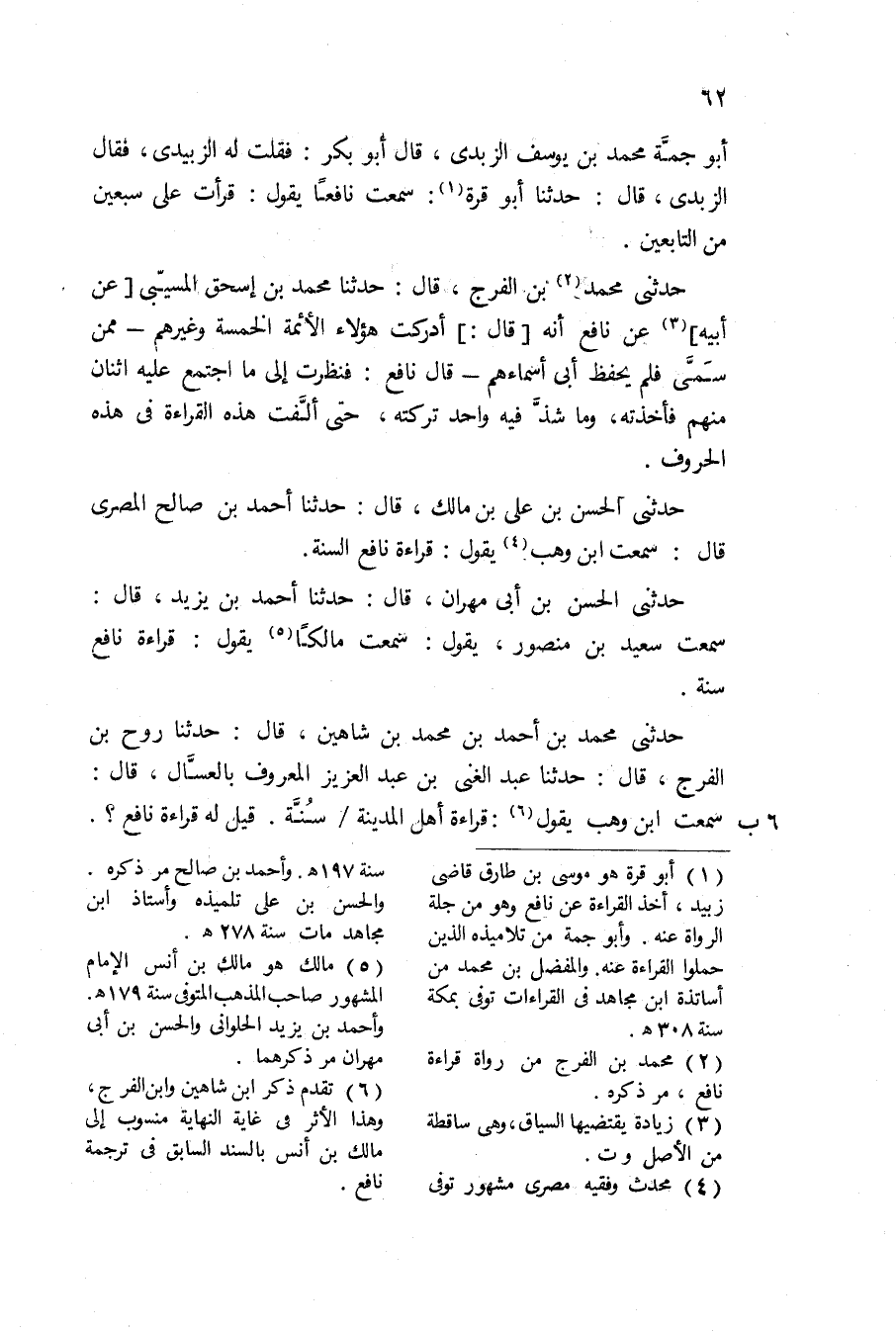 حَدثنِي الْحسن بن عَليّ بن مَالك قَالَ حَدثنَا أَحْمد بن صَالح الْمصْرِيّ قَالَ سَمِعت ابْن وهب يَقُول قِرَاءَة نَافِع السّنة