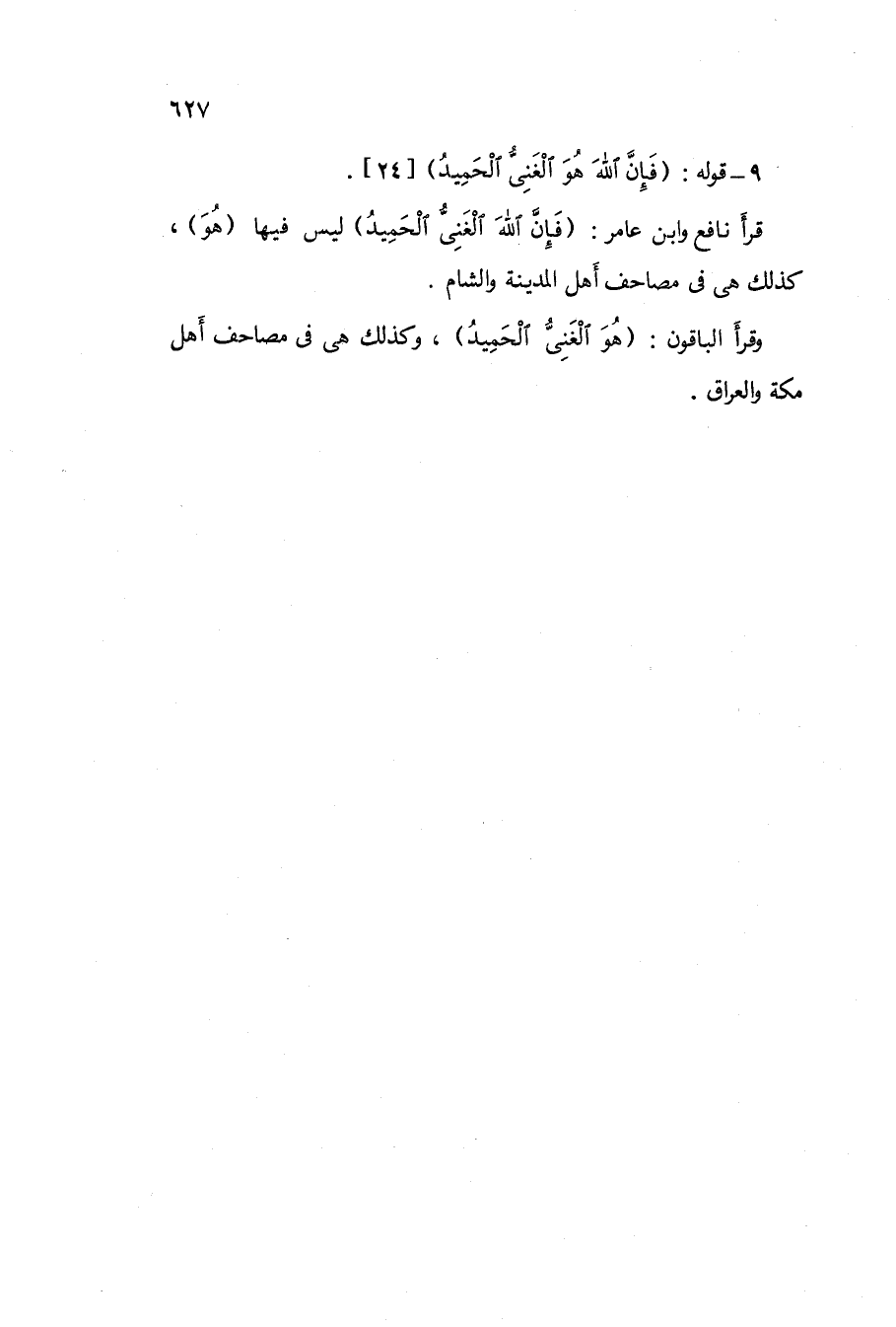 قَرَأَ نَافِع وَابْن عَامر / فَإِن الله الْغنى الحميد / لَيْسَ فِيهَا {هُوَ} كَذَلِك هى فى مصاحف أهل الْمَدِينَة وَالشَّام