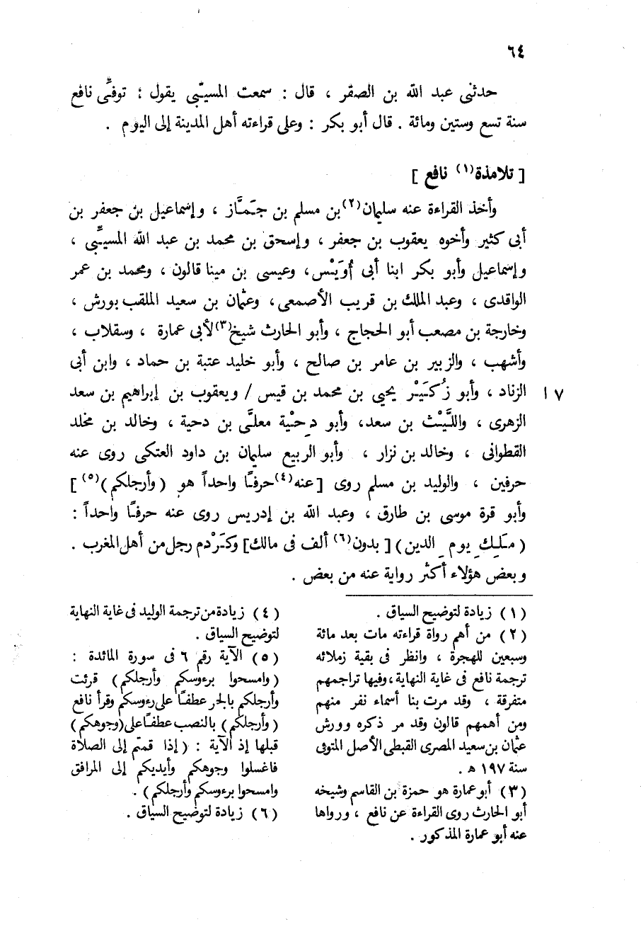 وَالزُّبَيْر بن عَامر بن صَالح وَأَبُو خُلَيْد عتبَة بن حَمَّاد وَعبد الرَّحْمَن بن أبي الزِّنَاد وَأَبُو زُكَيْرٍ يحيى بن مُحَمَّد بن قيس وَيَعْقُوب بن إِبْرَاهِيم بن سعد الزُّهْرِيّ وَاللَّيْث بن سعد وَأَبُو دحْيَة مُعلى بن دحْيَة وخَالِد بن مخلد الْقَطوَانِي وخَالِد بن نزار وَأَبُو الرّبيع سُلَيْمَان بن دَاوُد الْعَتكِي روى عَنهُ حرفين والوليد بن مُسلم روى عَنهُ حرفا وَاحِدًا هُوَ {وأرجلكم} وَأَبُو قُرَّة مُوسَى بن طَارق وَعبد الله بن إِدْرِيس روى عَنهُ حرفا وَاحِدًا / ملك يَوْم الدّين / بِدُونِ ألف فِي مَالك وكردم رجل من أهل الْمغرب