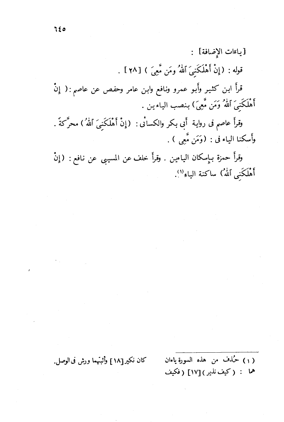 وَقَرَأَ نَافِع فى رِوَايَة ورش / نذيرى / 17 و / نكيرى / 18 بياء فى الْوَصْل وَلم يَأْتِ بذلك عَن نَافِع غَيره