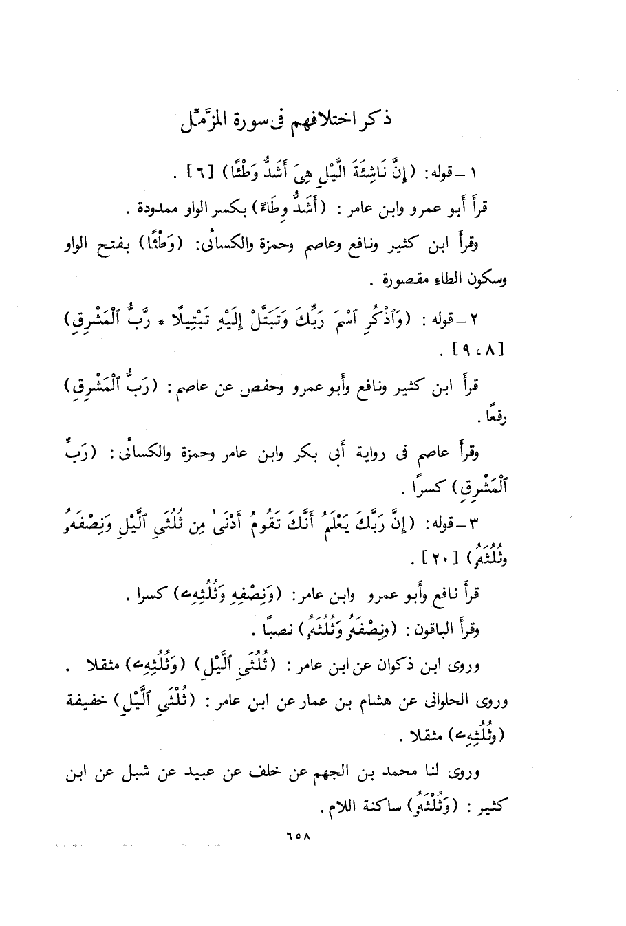 وروى الحلوانى عَن هِشَام بن عمار عَن ابْن عَامر / ثلثى الَّيْلِ / خَفِيفَة {وَثلثه} مُثقلًا