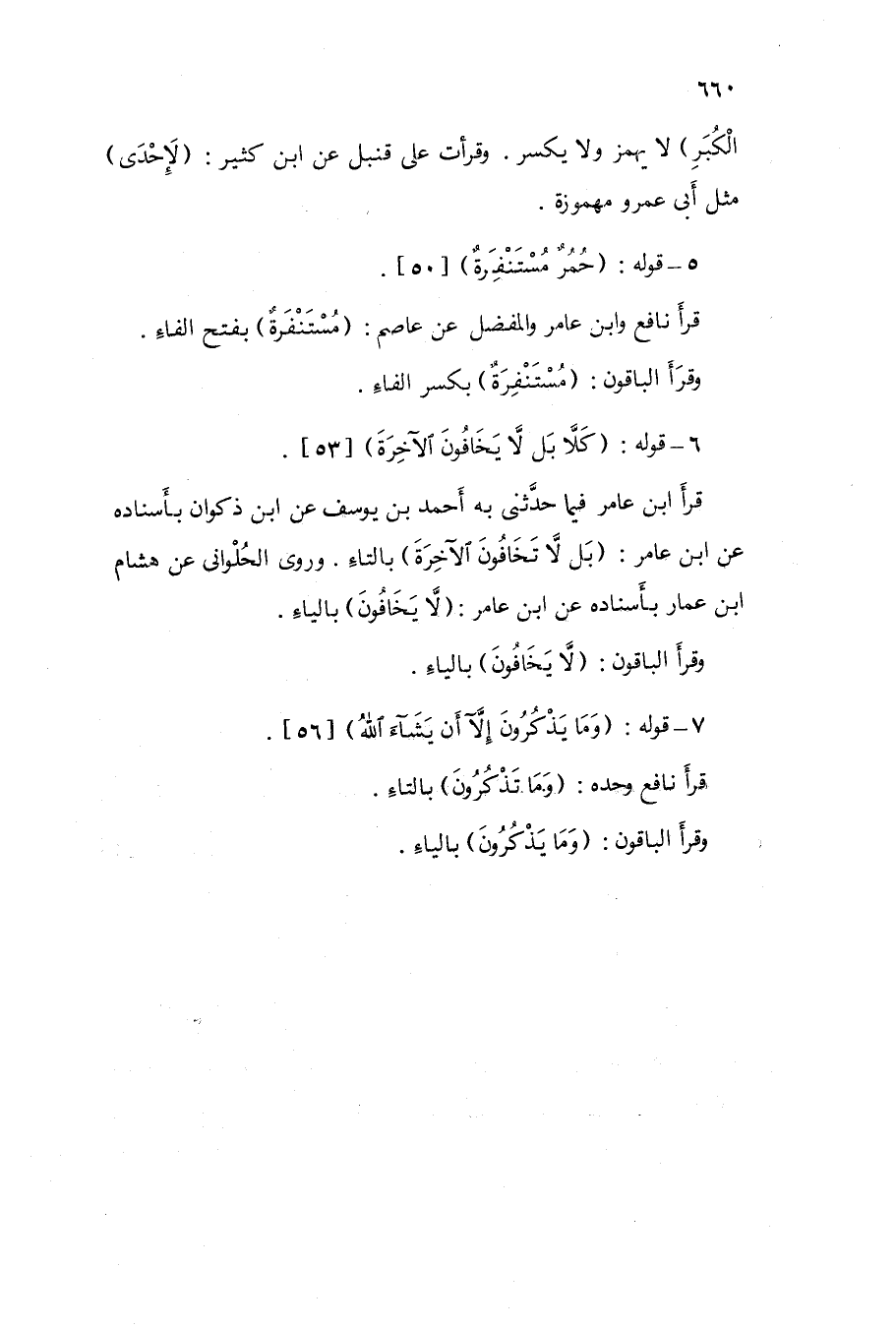 قَرَأَ ابْن عَامر فِيمَا حَدَّثَنى بِهِ أَحْمد بن يُوسُف عَن ابْن ذكْوَان بأسناده عَن ابْن عَامر / بل لَا تخافون الْآخِرَة / بِالتَّاءِ