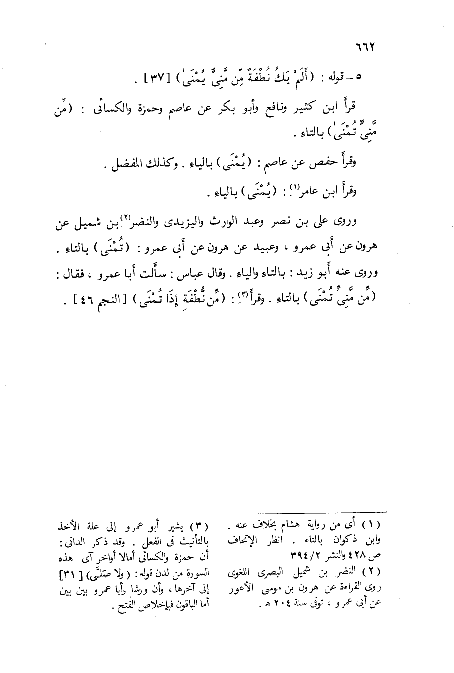 قَرَأَ ابْن كثير وَنَافِع وَأَبُو بكر عَن عَاصِم وَحَمْزَة والكسائى / من منى تمنى / بِالتَّاءِ