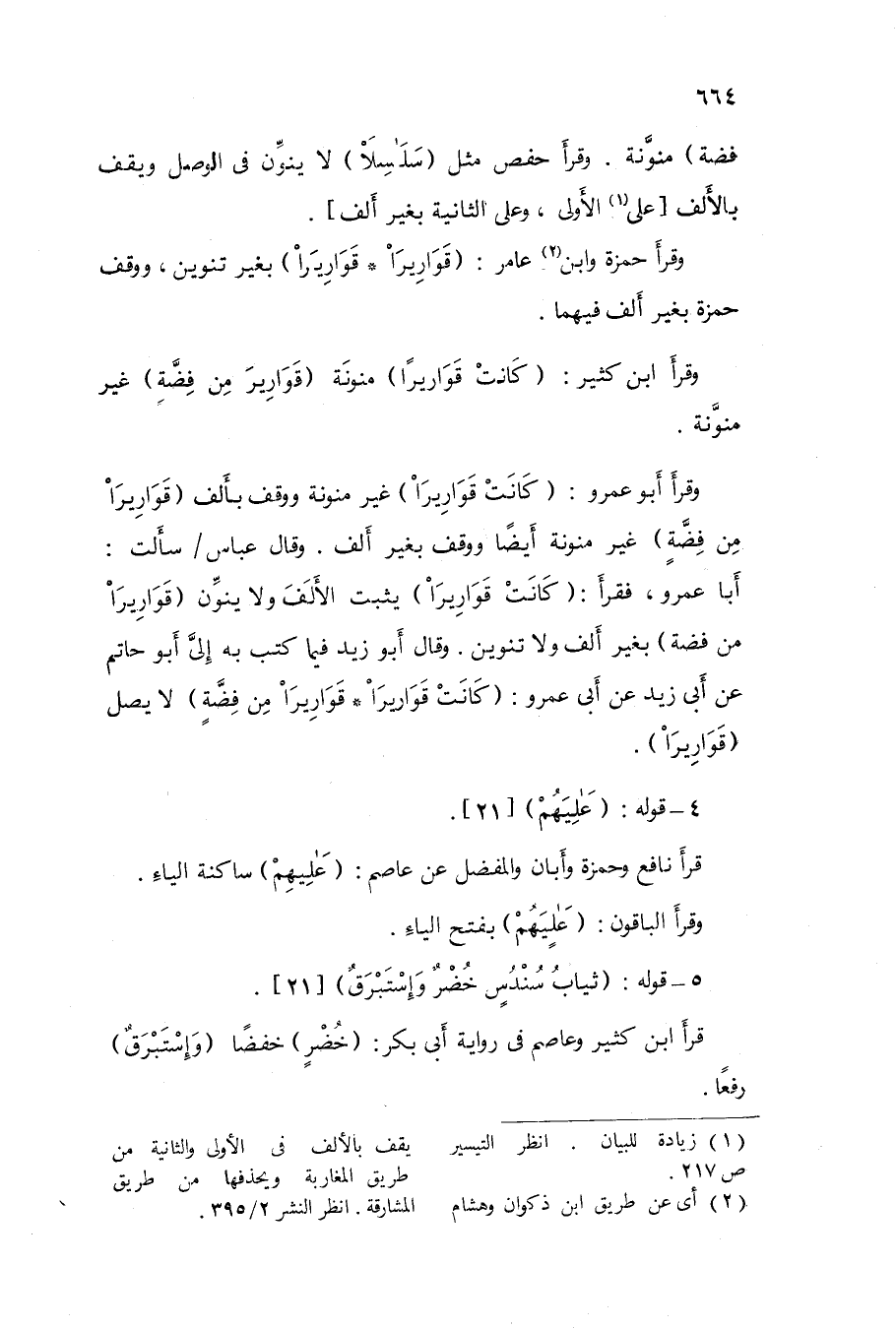 وَقَرَأَ أَبُو عَمْرو {كَانَت قواريرا} غير منونة ووقف بِأَلف / قواريرا من فضَّة / غير منونة أَيْضا ووقف بِغَيْر ألف