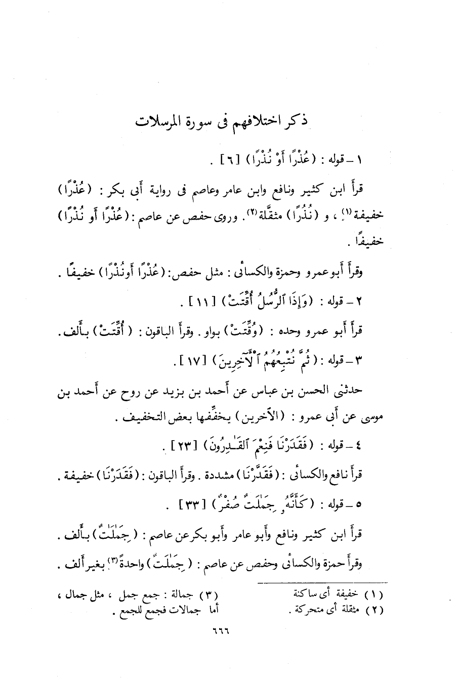 قَرَأَ ابْن كثير وَنَافِع وَابْن عَامر وَعَاصِم فى رِوَايَة أَبى بكر {عذرا} خَفِيفَة و {نذرا} مثقلة